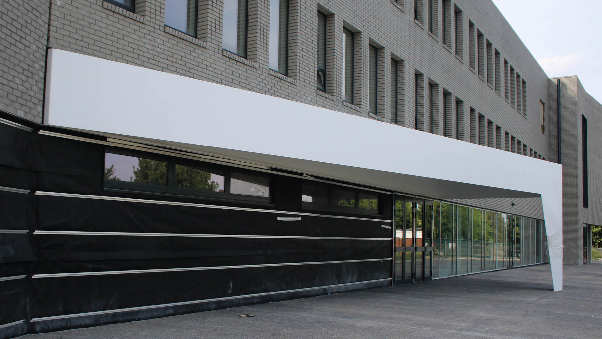The construction of a new school building for the Royal Athenaeum of Ans in the Belgian village of Alleur was accompanied by the installation of a large, strikingly shaped steel canopy, 20 metres long by 4.5 metres wide, and with an imposing mass that subtly culminates in a single support. The horizontal and vertical parts of the canopy (the roof and support respectively) are designed as a single geometry with – thanks to the concealment of assembly points, rainwater collection and drainage – an austere and almost abstract appearance. The dimensioning of the canopy is based on the principle of a welded steel portico in which the rod that serves as the canopy edge doubles up as the load-absorbing girder. This rod rests upon a variable cross-section column housing the rainwater drain and attached using invisible bolts. The white coating lends presence to the structure, whilst at the same time imbuing it with it a certain lightness.