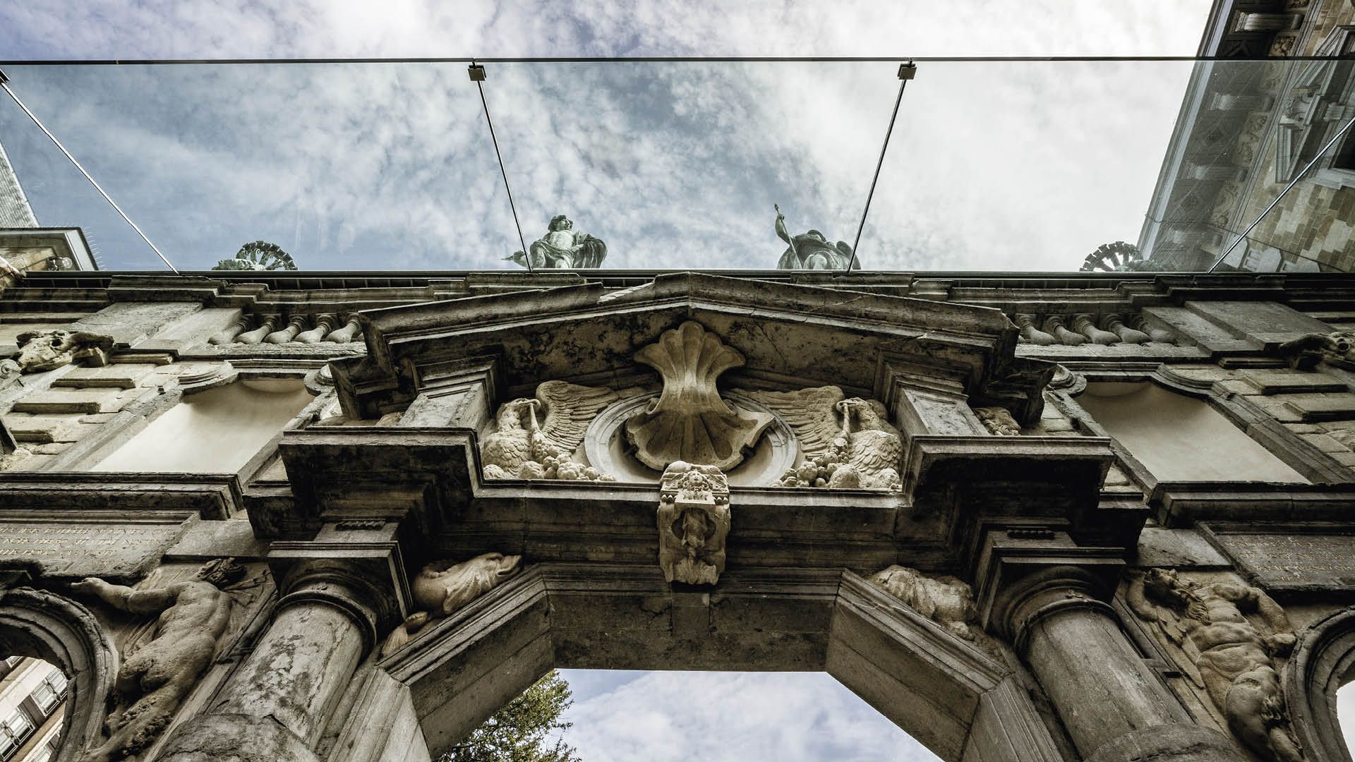 La Maison Rubens à Anvers a été conçue par Pierre Paul Rubens (début du XVIIe siècle) et fait aujourd’hui office de musée. Le portique de la maison, l’un des deux éléments d’origine et patrimoine protégé, a été affecté au fil des ans par l’érosion de la pierre et les intempéries. Afin de préserver au mieux le portique, un auvent discret a été placé au-dessus de celui-ci pour le protéger des dommages futurs. Cet auvent papillon en verre, d’une longueur de 15,60 m et d’un poids de 30 tonnes, a pour structure de base trois caissons en acier inoxydable microbillé. Ceux-ci ont été placés sur le portique de 12 m de haut au moyen d’une grue. Une fois les caissons installés, ils ont été ancrés dans les colonnes du portique et ensuite remplis de plomb. Cela a conféré à l’auvent la solidité et la résistance au vent nécessaires. De surcroit, la structure a été dotée de socles réalisés sur mesure pour les statues qui ornent le portique. Les feuilles de verre laminé sont prises en tenaille par des profils de serrage uniques en acier inoxydable.