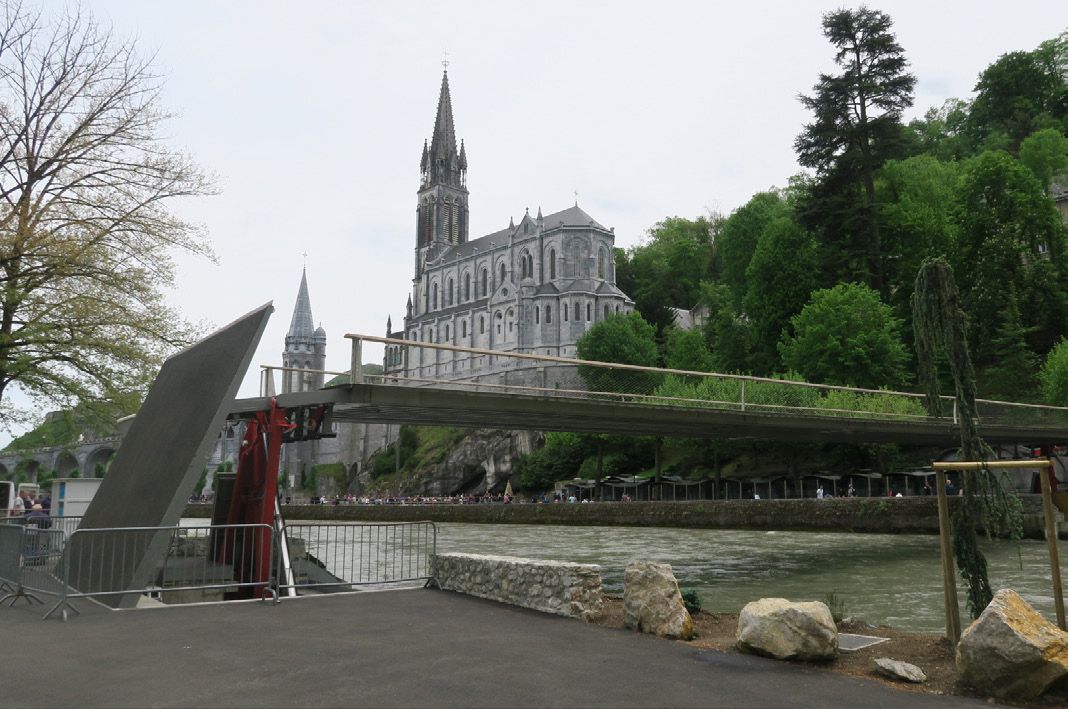 Le site du Sanctuaire de Lourdes est un lieu chargé d’histoire, de spiritualité et de silence. En juillet 2013, une crue a provoqué d’importants dommages aux ouvrages existants. Afin de laisser passer la « colère » du Gave de Pau, une passerelle a été conçue pour se lever grâce à un système de vérins hydrauliques logés dans les culées de l’ouvrage. La structure et le platelage sont réalisés en inox duplex. La passerelle se caractérise par sa finesse (40 cm d’épaisseur pour 38 m de portée).