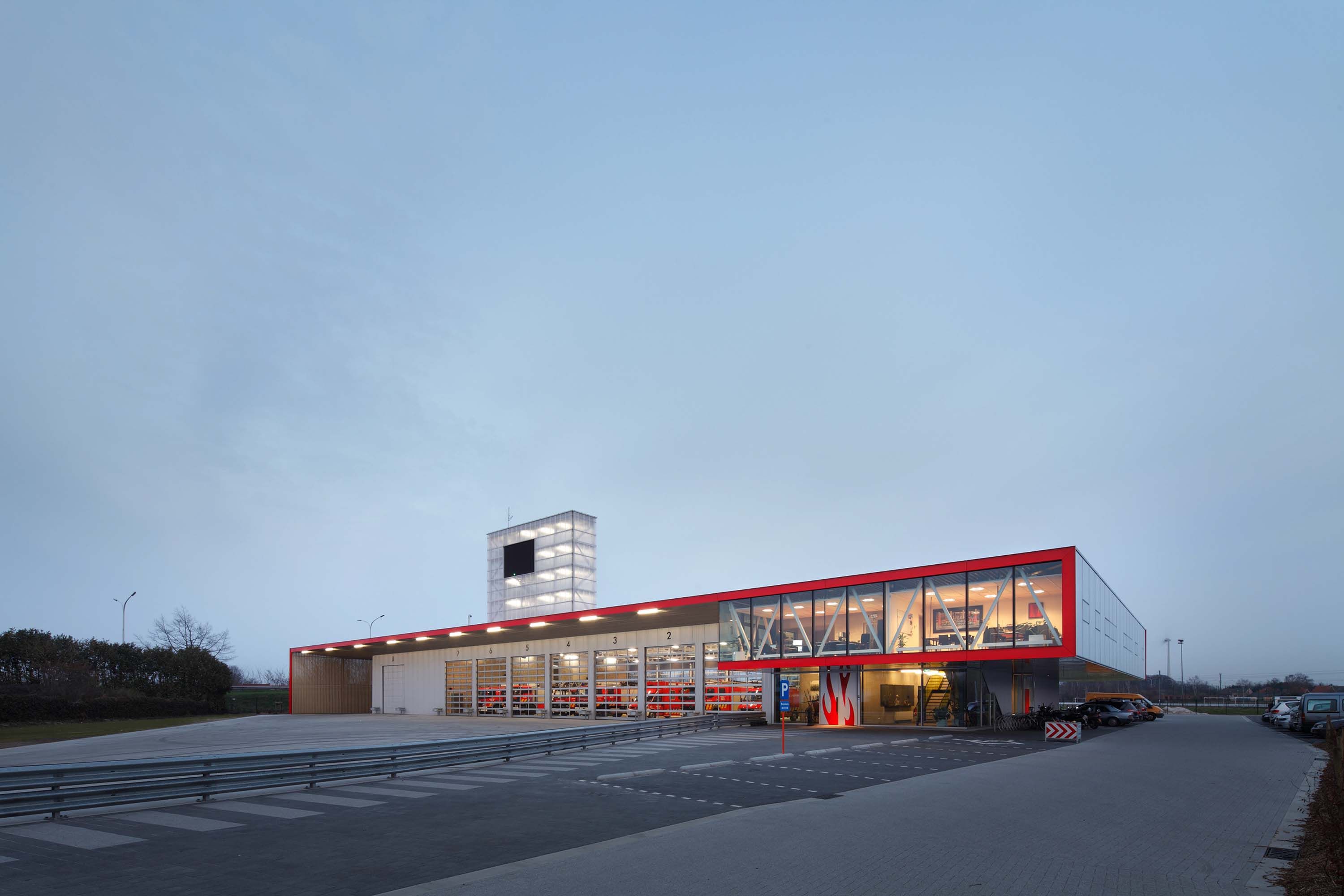 La nouvelle caserne de pompiers de Puurs est située sur la N16, une importante voie d’accès qui per-met d’atteindre rapidement les villages et terrains industriels des environs. Le projet de Compagnie-O architectes de Gand part de la logique inhérente à la fonction de caserne de pompiers, machinale et complexe, mais y ajoute en même temps une signi-fication et une valeur esthétique supplémentaires, sans transiger sur l’aspect fonctionnel. La tour de séchage des lances d’incendie, transparente et haute de 22 m, joue littéralement le rôle d’enseigne pour le corps de pompiers et pour la Commune de Puurs
