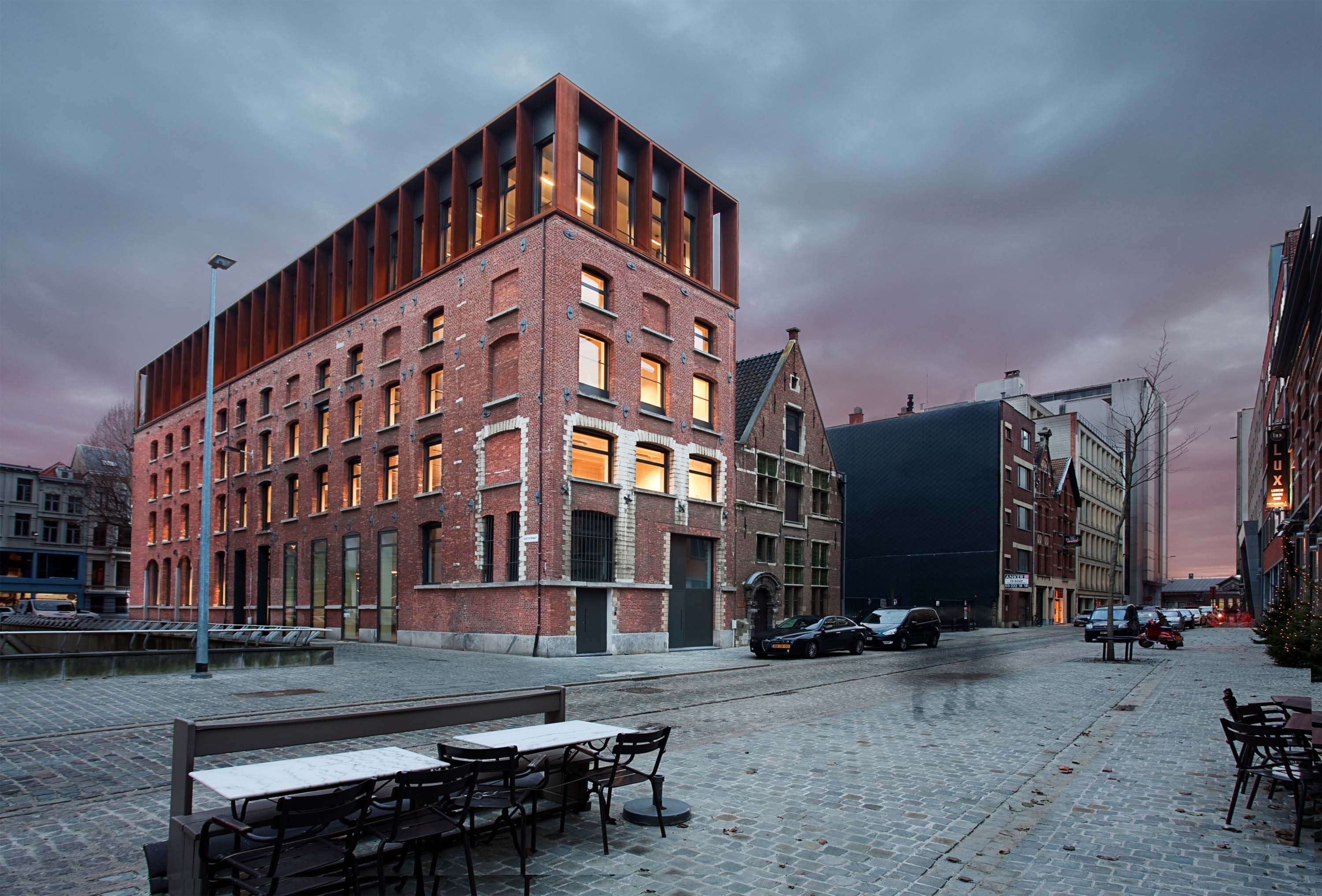 Cet ancien entrepôt du vieux quartier portuaire d’Anvers a reçu une nouvelle affectation en 2009-2010. Le bureau d’architectes anversois Stramien l’a transformé en bureaux neufs pour la sociète SD-Worx, en respectant son caractère industriel historique. Le bâtiment rénové est un empilement de plateaux ouverts, largement baignés de lumière naturelle. À l’arrière, contre le mur mitoyen, un long noyau est prévu à chaque étage et abrite les équipements fixes. La toiture existante a été rem-placée par une nouvelle structure transparente en acier, parachevée par de tôles en acier auto-pati-nable. Le rythme et la régularité de ce volume ren-voient à l’architecture rigide en briques de l’ancien entrepôt. Afin de réaliser une toiture la plus légère possible, le choix s’est porté sur l’acier comme matériau de construction.