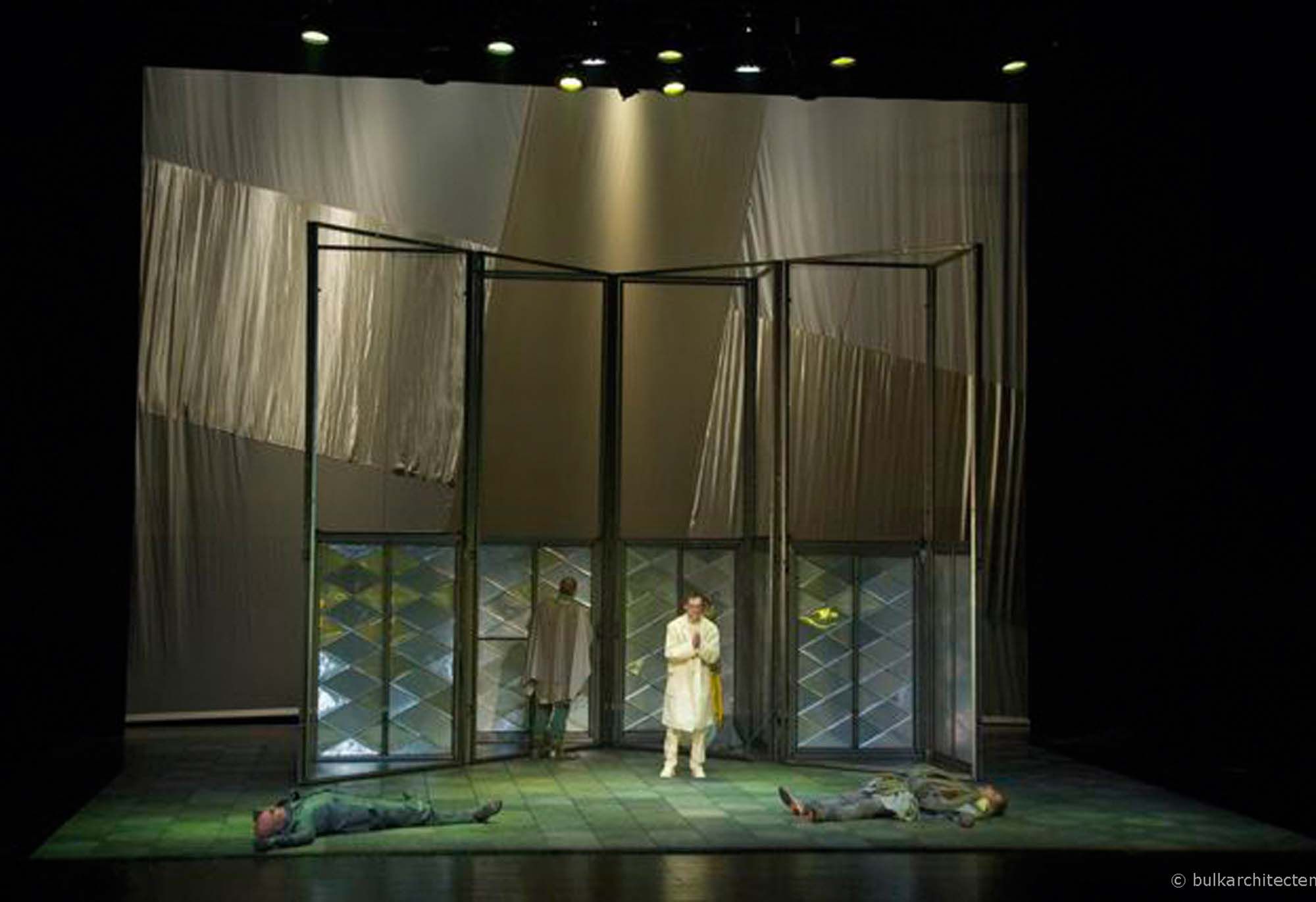 Pour le dixième anniversaire du théâtre anversois pour enfants hetPaleis, Dimitri Leue a imaginé le drame royal ‘Armandus de Zoveelste’. Le décor est une étude architectonique en soi, une structure complexe en acier qui évolue au cours de la représentation : d’abord sculpture influençant l’espace par sa forme, puis littéralement délimitation de l’espace.