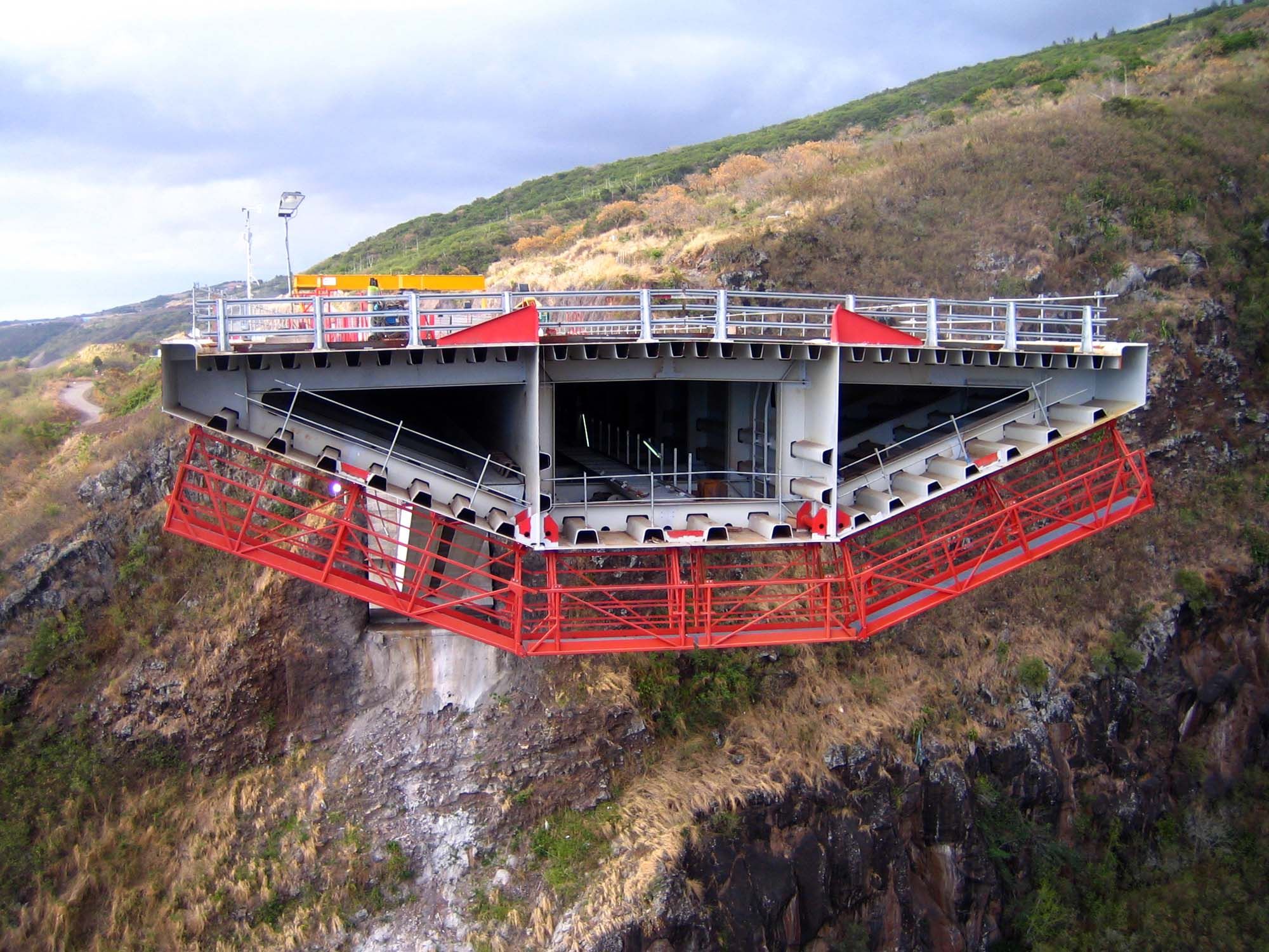 La conception de l’ouvrage final et de sa méthode de construction a du tenir compte de contraintes fortes: les dimensions de la ravine à franchir et son inaccessibilité. C’est un pont à béquille qui a été retenu pour franchir près de 300 m à 170 m de haut. Le fonctionnement de l’ouvrage sous charges de poids propre est particulier: ce n’est pas celui d’un arc, habituellement rencontré pour un pont à béquille mais bien celui d’une structure en encorbellement. De gigantesques culées à contrepoids enterrées équilibrent la structure par l’intermédiaire de câbles de précontrainte. Seules des charges verticales sont transmises au terrain. Le tablier de 20 m de large et 288 m de long est un caisson entièrement métallique à dalle orthotrope. Des aciers de précontrainte (torons gainés graissés et torons clairs fprg 1860 N/mm²) sont également utilisés, dans les bracons, dans les culées, et au travers du tablier et des culées, pour forcer le fonctionnement et mobiliser le contrepoids.