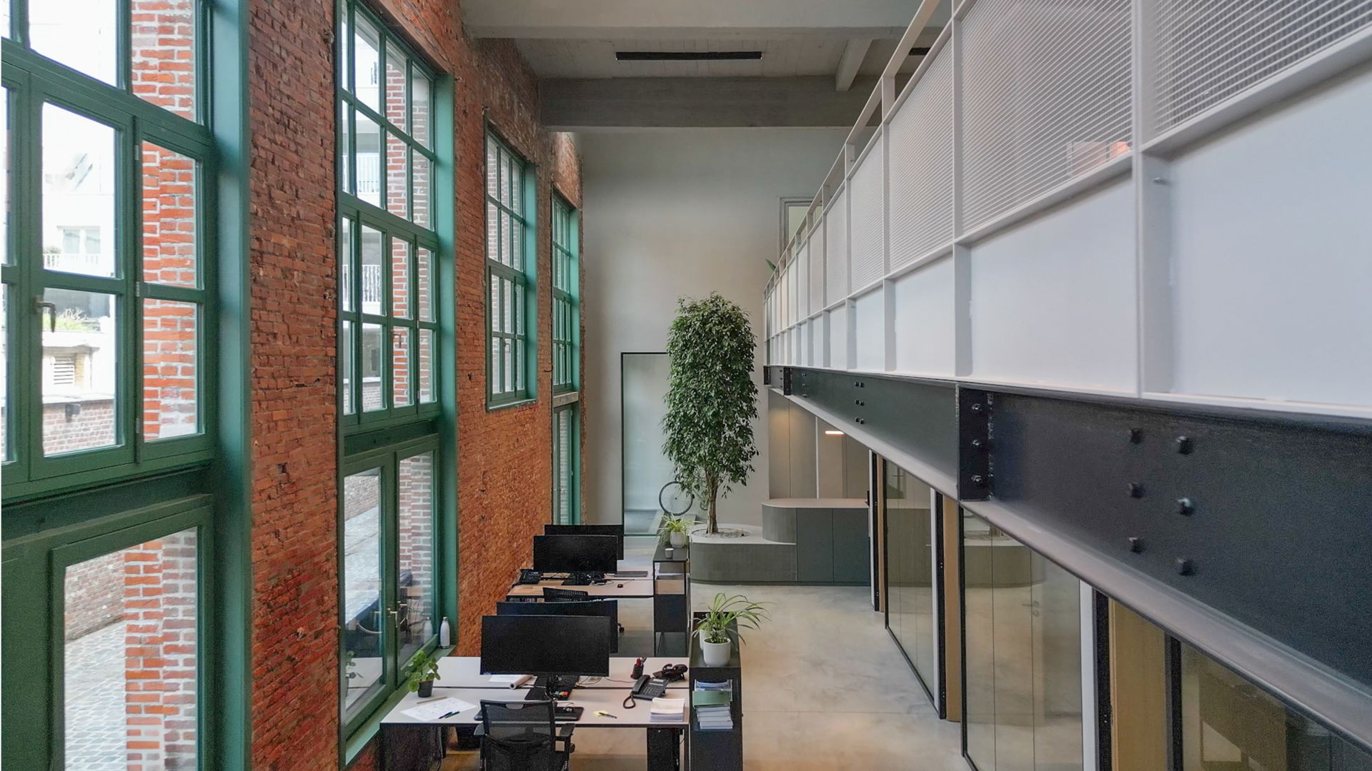 La conception flexible combine un contexte industriel et historique avec un design de bureau contemporain.