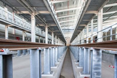 <p>De fasering van de gesloten ruwbouw werd ook zo georganiseerd dat de veelheid aan bewegingen van het geraamtete kunnen opvangen, rekening houdend met de zuigers die de poorten bedienen: het dakcomplex werd dus vóór de poorten geïnstalleerd. Tijdens de montage werden de spanten voorgemonteerd op de grond voordat ze werden opgetild. </p>