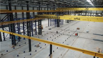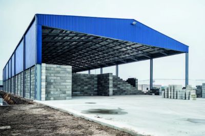 <p>Le bâtiment, d'une superficie de 70x126 m, est constitué d'une structure en acier, combinée à des panneaux sandwich en béton, à un bardage en acier isolé et à une toiture en acier isolée. Cette usine offre non seulement un espace pour la production des éléments, mais aussi des installations pour le stockage des matières premières pour le béton, une usine de mélange et le stockage des panneaux déjà produits.</p>