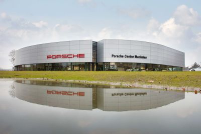 Tekst: Het Porsche Centre van Mechelen – het negende in België - weerspiegelt de exclusiviteit van het Duitse automerk. Het complex beslaat in totaal 3.500 m2 met een toonzaal die plaats biedt aan 19 Porsche-modellen. Voor de constructie moest rekening worden gehouden met de strakke richtlijnen van de autobouwer uit Stuttgart. De gevels van de toonzaal worden gebogen modulaire cassettes vooropgesteld. De stalen buitenplaat met een dikte van 0,7 mm is gemaakt van voorgelakte staalplaat voorzien van een coating Colorcoat Prisma®.