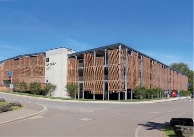 Tekst: Deze publieke parkeergarage van drie verdiepingen is gebouwd in een overstromingsgebied en heeft een totale capaciteit van 502 plaatsen (inclusief een lift). De belangrijkste structurele elementen maken gebruik van gelaste plaatliggers op maat voor de kolommen en balken, gecombineerd met beton met behulp van deuvels. Om het gewicht van de constructie en de afmetingen van de profielen te beperken, zijn de kolommen en liggers vervaardigd in staalkwaliteit S460. Vooraf werd er in de fabriek een anticorrosiebehandeling toegepast. Doordat de balken zo gedimensioneerd zijn dat ze zelfdragend zijn bij de plaatsing van de vloerplaten, konden de werkzaamheden snel en efficiënt verlopen. Om het gebouw visueel te verfraaien, is een flexibele huid aan het metalen frame van de constructie bevestigd. Dit bestaat uit een gevlochten grid van staaldraden, waarin geëxtrudeerde stukken gebakken klei zijn aangebracht.