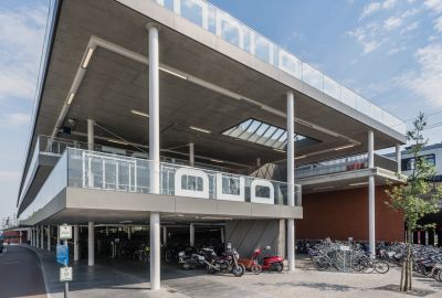 Tekst: Het transparante fietsparkeergebouw wordt een volwaardige voordeur voor het station aan de Posthoflei. Het biedt plaats aan 2.150 fietsen en vormt tegelijk een nieuwe toegang. De stalen kolommen en betonnen vloerplaten zijn zeer slank. Dit betekent veel wapeningsstaven in de vloerplaten boven de stalen kolommen. 91 stalen buiskolommen met een doorsnede van 323,9 mm werden geplaatst. De zwaarste kolom heeft een gewicht van 1,3 ton. Het staal is gegalvaniseerd en in 3 lagen geschilderd.