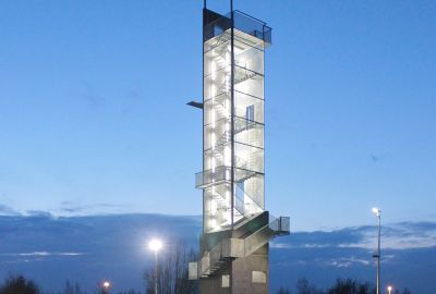 - Tekst: De ronde vorm van het hoofdgebouw vloeit rechtstreeks voort uit het pad dat de interventievoertuigen volgen. Er werden twee trajecten voorzien: het ene, binnen, voor wie terugkeert van een interventie en het andere, buiten, voor de vertrekkers. Een oefentoren in dompelverzinkt staal staat naast het hoofdgebouw. Hij steunt op een betonnen basis met een zijde van 3 m. Een geperforeerde metaalplaat van slechts 2 mm dik stut op zijn eentje de 25 m hoge metalen toren.