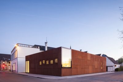 - Tekst: Pour contraster avec les façades enduites blanches du bâtiment protégé, la façade de la nouvelle partie a été équipée de panneaux en acier résistant aux intempéries. Sur ces derniers, un relief a été prévu avec des « bulles » qui ont été perforées à des endroits définis de manière à introduire une lumière filtrée dans la bibliothèque. Les grandes fenêtres aux angles du nouveau volume confèrent à la bibliothèque la visibilité exigée et permettent une interaction avec l’environnement.