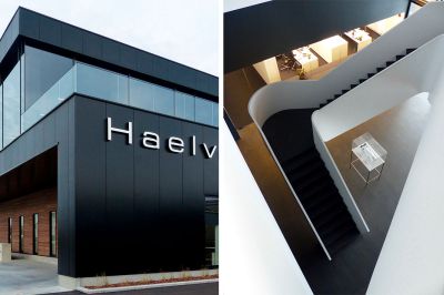 Tekst: Het bestaande éénlaagse, architecturaal gedateerde pand kreeg er een totaal nieuw volume bovenop. De opbouw gebeurde met stalen portieken op een raster van 6 m en is op 90 paalfunderingen gezet. Voor het bovenste volume werd gekozen voor een accentuerende, zwarte gevelbekleding. Deze bestaat uit voorgelakte geprofileerde staalplaten met 150 mm isolatie. In de inkom is een stalen trap voorzien, die in bovenaanzicht de vorm heeft van het driehoekig logo van het bedrijf.