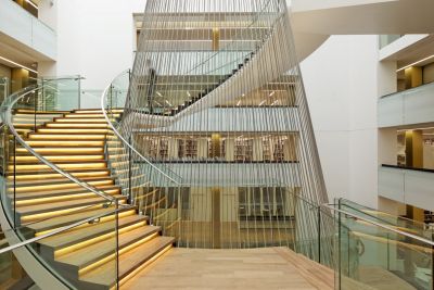 Tekst: Het gebouw waarin de bibliotheek is ondergebracht, dateert uit het einde van de 19e eeuw en heeft in de loop der tijd heel wat verbouwingen ondergaan. De wijzigingen uit de jaren '50, waardoor de capaciteit op hetzelfde oppervlak verdubbeld werd, leidden tot instortingsgevaar in geval van brand. In deze context werd dan ook beslist om de bibliotheek van boven tot onder te renoveren. Een centrale monumentale trap bedient de 4 verdiepingen. Hij steunt op de verschillende overlopen en hangt met roestvaststalen kabels op aan de koepel.