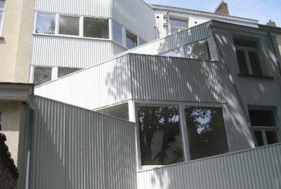 Tekst: La transformation de cette maison mitoyenne unifamiliale en un triplex et 3 chambres d’hôtes consiste en deux interventions principales : la reconstruction de la façade arrière et une rehausse partielle de la toiture. La structure des annexes est réalisée au moyen d’un jeu de poutres et colonnes en acier. Toute la peau des annexes de la façade arrière est quant à elle réalisée en tôle ondulée blanche (galvanisée et prélaquée).