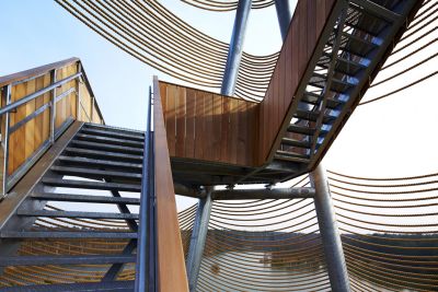 Tekst: A présent qu’une tour d’observation de 30 m garantit une vue magnifique sur la région, les amateurs de nature et d’architecture goûtent encore plus, désormais, le Sahara lommelsois, un petit échantillon de nature intacte qui fait partie du Paysage Régional de la « Basse Campine ». Cette construction est constituée de six triangles enchaînés qui sont entourés par environ quatre kilomètres de cordage marin. En enveloppant la tour du cordage alternativement lâche et tendu, on crée une référence subtile aux lignes ondoyantes du Sahara.