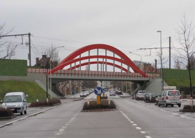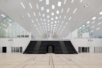 Tekst: La nouvelle construction comporte une salle de sport double d’une superficie de 4800 m² avec, au centre, les espaces de services et les tribunes. La structure de la toiture est constituée de trois voûtes en plein cintre, perpendiculaires à cette distribution. La structure particulière de la toiture confère au niveau bâtiment une identité propre qui dialogue avec la toiture voile mince de la piscine existante. La section transversale de la structure de la toiture est constituée d’une série de 3 axes à triple articulation construits à partir de profils HEB300 cintrés sur mesure.