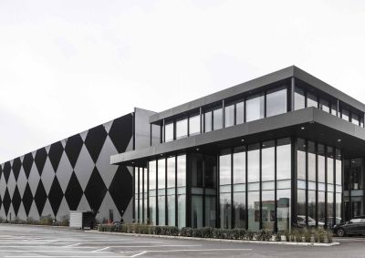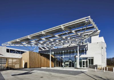 Tekst: De bestaande uitkragende betonplaat van de inkomzone werd vervangen door een sierlijk gebogen luifel van staal. De dubbelgekromde schaal rust op vier hoekpunten. Via EEM-berekening werd de vorm van de schaal verder geoptimaliseerd. De plaatdikte bedraagt 20 mm voor een staalkwaliteit S355, waardoor het totale gewicht van de luifel met een maximale hoogte van 5 m, op 24 ton komt. Om hanteerbare elementen te krijgen, werd de luifel bij de productie in 24 delen opgesplitst.