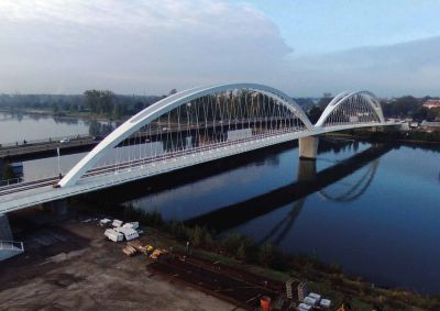 Tekst: A slender canopy has been built on the site of the University Hospital Gasthuisberg to accentuate the central circulation hub and guide visitors efficiently to their destination. The canopy covers the large circulation deck that incorporates the staircase and lift complex, and forms an important visual landmark at the western entrance zone. Measuring 43 x 27 m, it features a fully glazed steel structure with a large overhang to the side that provides shelter from driving rain. The construction height of the canopy decreases from 1,200 mm at the columns to 200 mm at the edges. The required structure is concentrated in 30 mm thick fins in S235 steel, which lie diagonally across the plane of the canopy and are welded together at nodes to form a single 1.4 m grid. The 16.5 m columns are made of S355 steel (type 406.4/30) and house the steel pipes for rainwater drainage and cabling for canopy lighting.