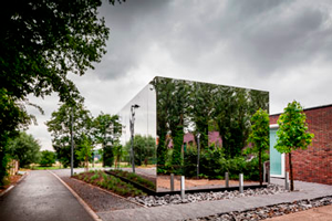 - De uitbreiding van een notariaat in Horebeke werd bekleed met roestvast staal in spiegelafwerking, een ontwerp vab Architecten Vens - Van Belle. “Spiegels zijn terug helemaal in. Weliswaar met een betekenisverschuiving. Daar waar reflecterende vlakken eertijds veelal werden ingezet om beklemmende ruimtes groter te doen lijken of om meer licht binnen te brengen, halen ontwerpers nu vaak het argument van parallelle werelden aan.” (Dominique Pieters in Info-Steel magazine 44)