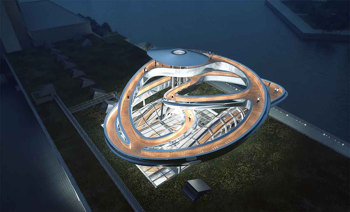 In het midden van de loods is een grote sparing gemaakt van ca 25-27m2. Op deze plaats is door MAD architects een tornadovormig kunstwerp ontworpen. Dit kunstwerk dient als loopbrug naar een uitkijkbordes, waarvan men kan genieten van een prachtig uitzicht op de stad. De tornadoconstructie is uitgevoerd als spaceframe van ronde buizen. Dit spaceframe wordt afgewerkt met een roestvast stalen bekleding. In de sparing in de bestaande loods is een tafelconstructie gemaakt waar de tornado geplaatst wordt. Hiermee wordt de tornado losgehouden van de bestaande betonconstructie.