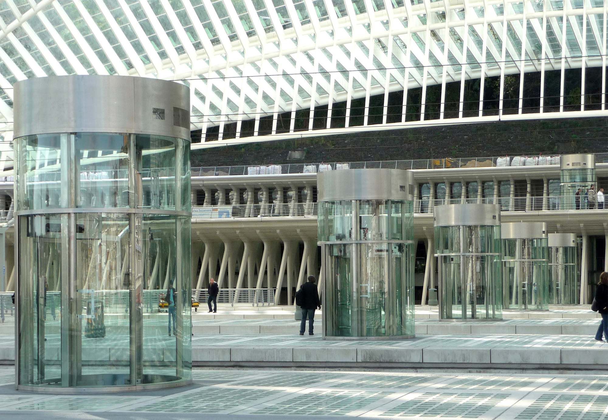 Le projet consiste dans la réalisation de 6 ensembles de charpentes en acier pour les ascenseurs panoramiques transportant les usagers depuis la galerie commerciale aux quais d’embarquement et aux passerelles supérieures d’accès. La réalisation est faite d’une structure tubulaire légère en acier inoxydable. Elle est constituée d’anneaux successifs reliés par des fines colonnes. Les travaux devaient également comprendre la mise en œuvre de la vitrerie bombée. Les verres feuilletés sont pincés par des plats métalliques sur les anneaux. Les parties techniques de l’ouvrage sont habillées par de la tôlerie en inox brossé grain 320 qui marque l’extrémité supérieure des cages d’un couronnement scintillant. L’aspect esthétique est en cohérence avec le reste du bâtiment et plus particulièrement les châssis en acier des vitrines des boutiques.