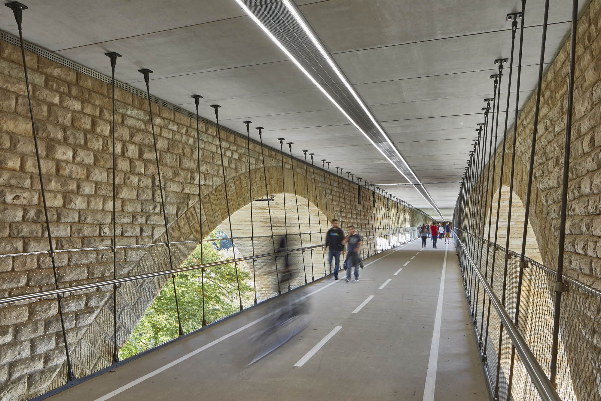 Le pont Adolphe relie deux quartiers importants de Luxembourg-Ville, la ville haute et le quartier de la gare. Le pont, en service depuis 1903, a subi des dégâts par le trafic dense l’empruntant. A l’occasion des grands travaux de rénovation et de réhabilitation, le tablier du pont a été élargi pour ajouter deux voies destinées au tram. Combiner une piste cyclable avec les trottoirs aurait demandé de rehausser les balustrades existantes. Ce qui aurait modifié trop l’aspect de l’ouvrage dans ce site classé patrimoine mondiale de l’Unesco. La solution consistait en une passerelle suspendue entre les deux arcs en dessous du Pont Adolphe.