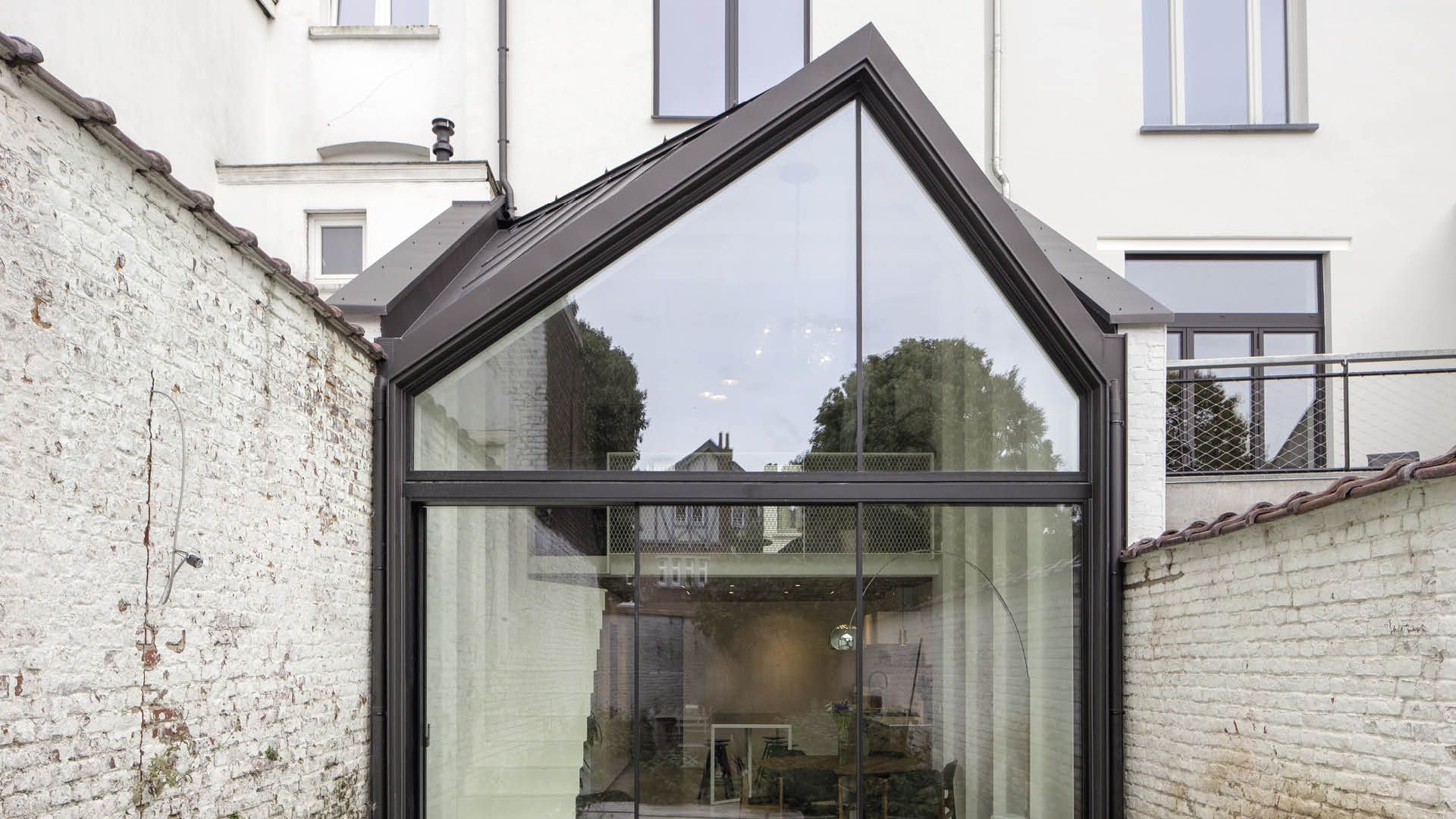 Au centre de Bruxelles, cette habitation privée s’est vue radicalement transformée grâce à l’ajout en façade arrière d’une extension en acier (4 x 4,5 x 6 m haut ; ± 4500 kg) conçue d’une seule pièce avec escalier intégré.