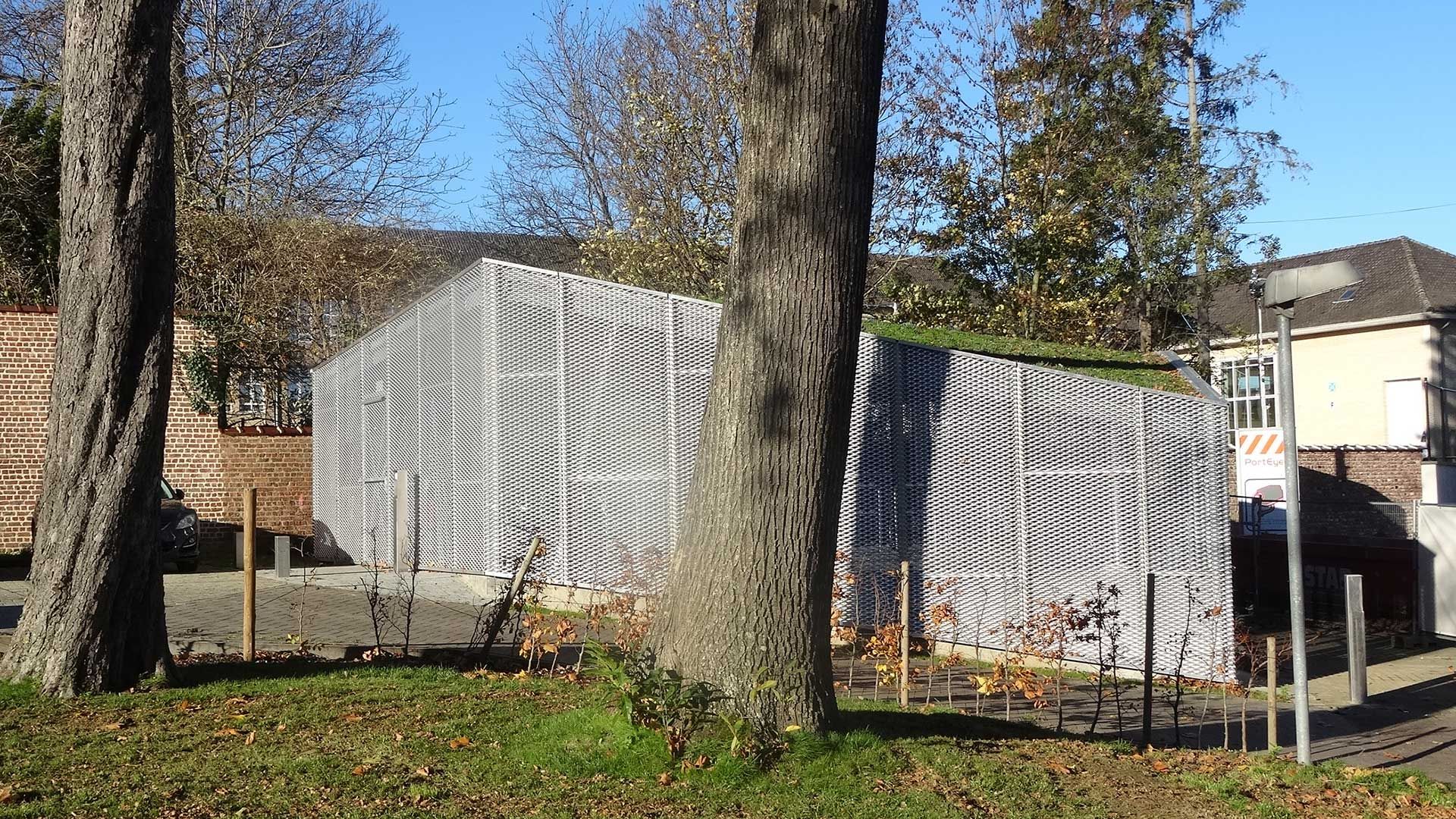 L’esthétique du pavillon des bicyclettes sur le site du CPAS de Halle rappelle, par l’application de metal déployé (SIGMA 115 S de Métal Déployé Belge), les éléments déjà existants tels que l’escalier de secours extérieur et l’enveloppe d’une gaine de ventilation.