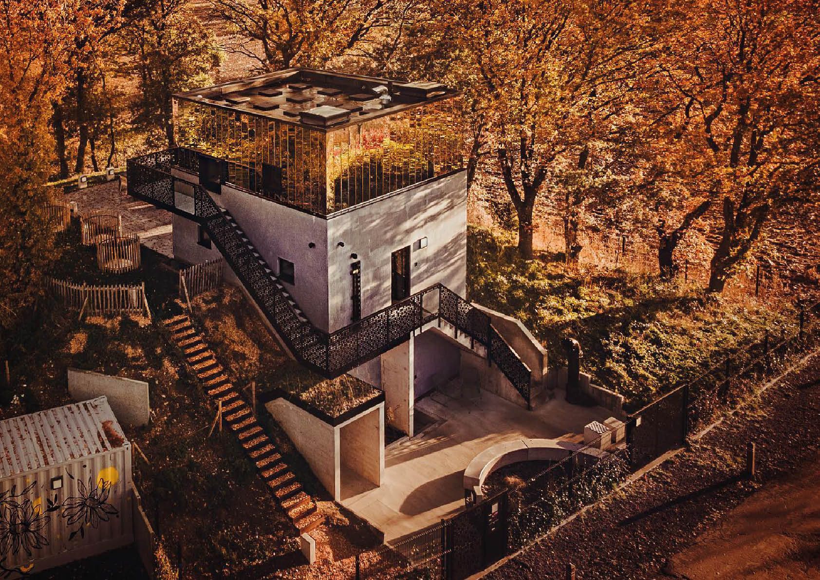 Le maître d’ouvrage voulait transformer un ancien réservoir à eau en un gîte insolite. La bâtiment originel en béton a été agrandi, et surmonté d’un nouveau niveau. Les façades de ce nouvel étage sont recouvertes d’un bardage « miroir » impressionnant, qui reflète l’environnement extérieur.