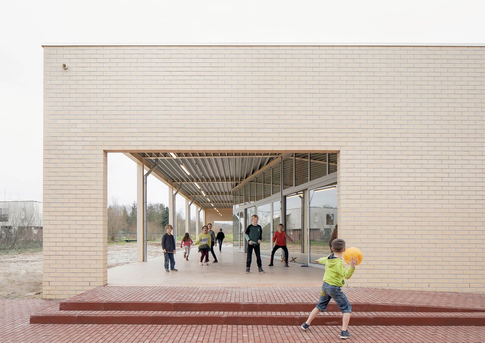 La municipalité a opté pour une structure très simple: une squelette d’acier avec des éléments de toiture légers en tôle d’acier profilée et perforée. Comme il fallait également tenir compte du budget limité, l’on a opté pour un volume réduit avec un plan symétrique.