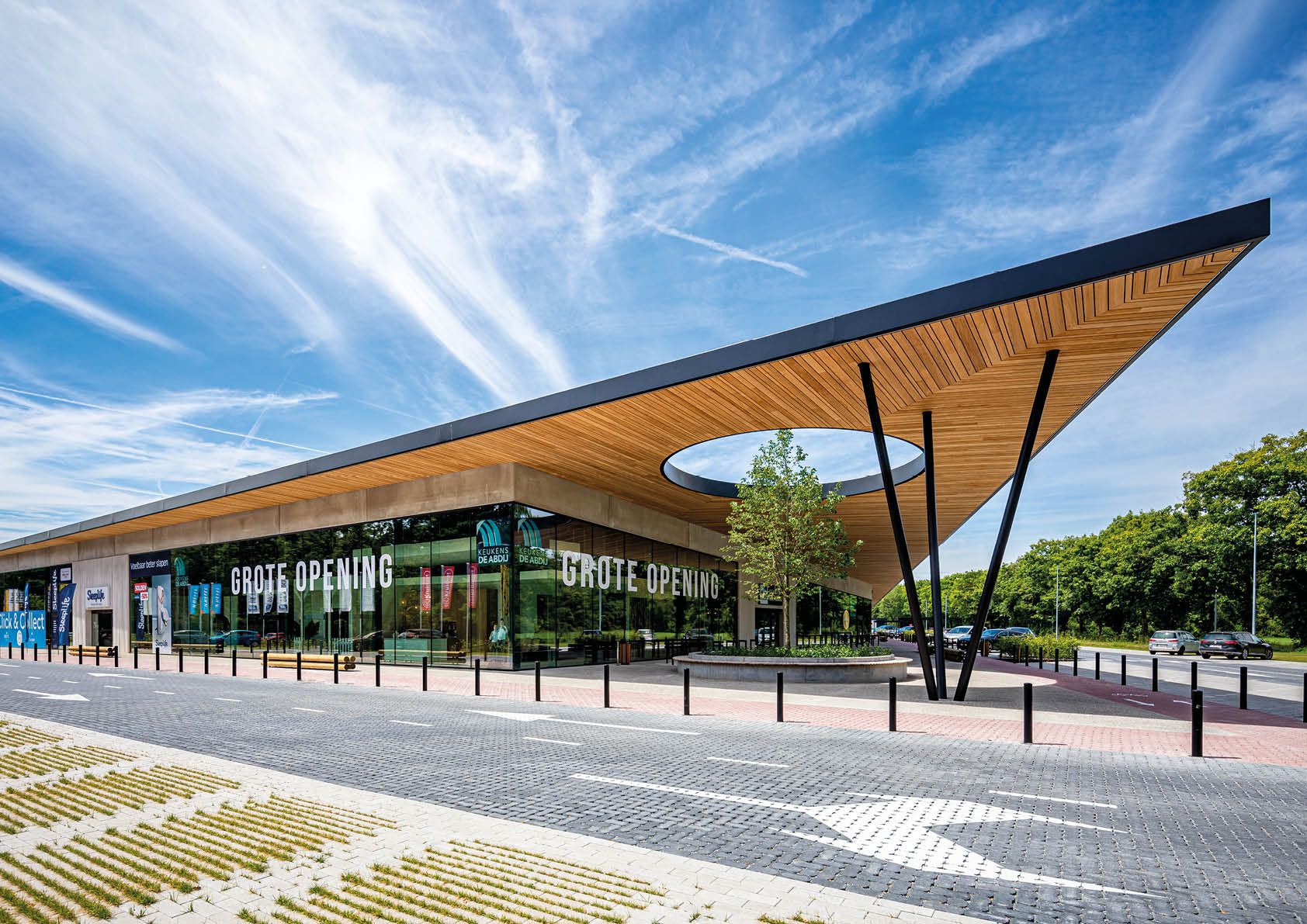 L’ancien site d’une entreprise de meubles à Zoersel a été transformé en un centre de shopping comprenant huit magasins. Afin de maintenir l’équilibre entre l’environnement naturel et les bâtiments, un auvent en acier remarquable et impressionnant de 17 mètres a été choisi. Une ouverture circulaire est prévue dans l’auvent dans lequel pousse un arbre de huit mètres de haut.
