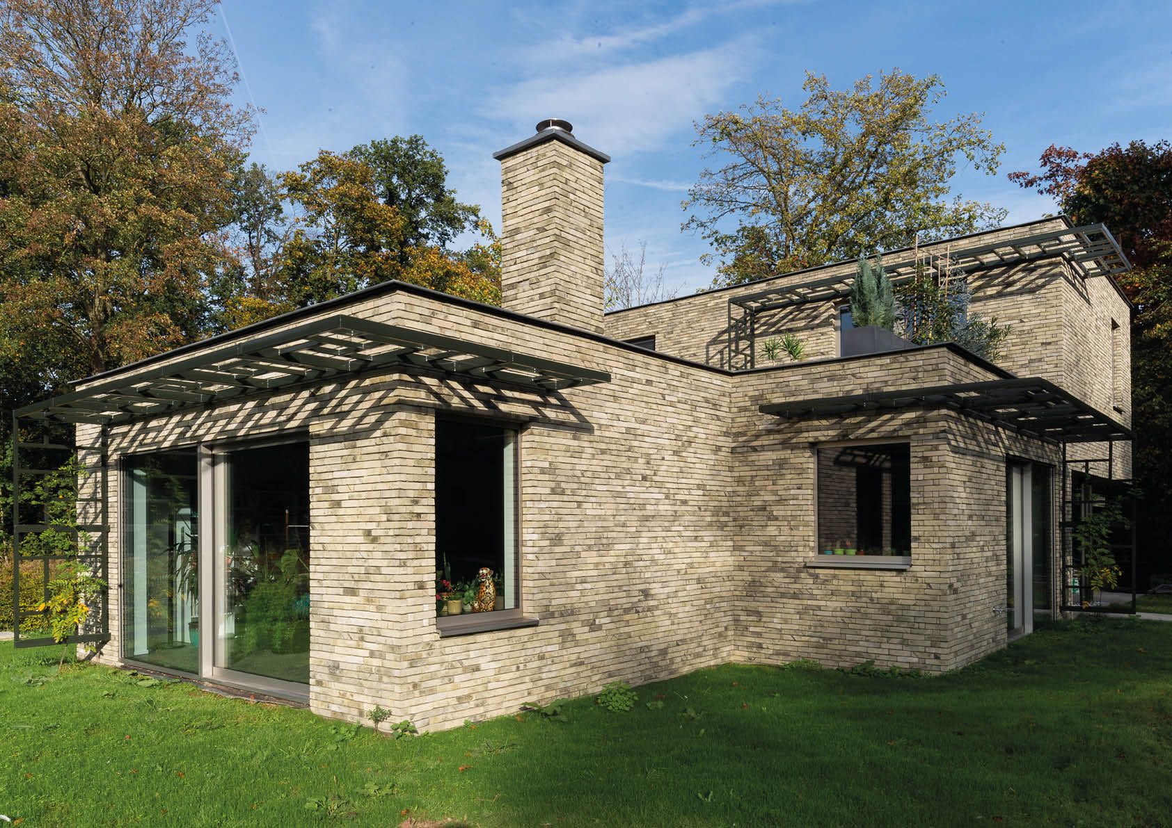 Grâce à sa forme, à l’utilisation judicieuse des matériaux et au choix spécifique des couleurs, cette maison unifamiliale, qui abrite également un bureau d’architecture, s’intègre parfaitement dans son environnement verdoyant. L’idée était d’éviter la surchauffe par les fenêtres vitrées orientées au sud et à l’ouest grâce à des plantes grimpantes, offrant ombre et fraicheur, sur trois auvents en acier. Ils se composent chacun de trois plans, divisés en segments avec un motif récurrent et suspendus entre des ailettes en acier fixées au gros oeuvre.