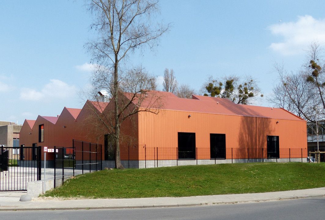 Les deux formations, ferronnerie d’art et maréchalerie, ont été réunies, avec cette nouvelle construction, à un seul emplacement pour offrir tout le confort contemporain aux élèves. La nouvelle école comporte un programme d’environ 1525 m2 et part d’un modèle de patio pour garantir la sécurité et la maîtrise du bruit. L’enveloppe de la construction en acier est constituée d’une tôle d’acier prélaquée de couleur cuivre. Cette couleur cuivre assure une présence du bâtiment dans le quartier sans qu’il soit perçu comme trop industriel.