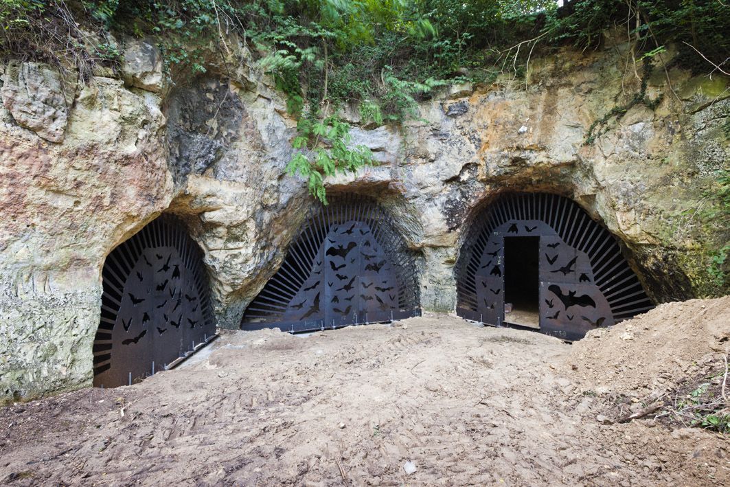 Le Waterkuil, un complexe de grottes marneuses à Vechmaal, est l’un des lieux d’hivernage les plus importants pour les chauves-souris au Limbourg. Depuis 2007, la population diminuait toutefois en raison de visiteurs indésirables qui y cherchaient des fossiles ou organisaient de petites fêtes. L’architecte-concepteur a imaginé des portiques artificiels en acier résistant aux intempéries (« corten ») pour fermer les cinq entrées du Waterkuil. Des silhouettes de chauves-souris servent ici d’accès pour ces animaux.