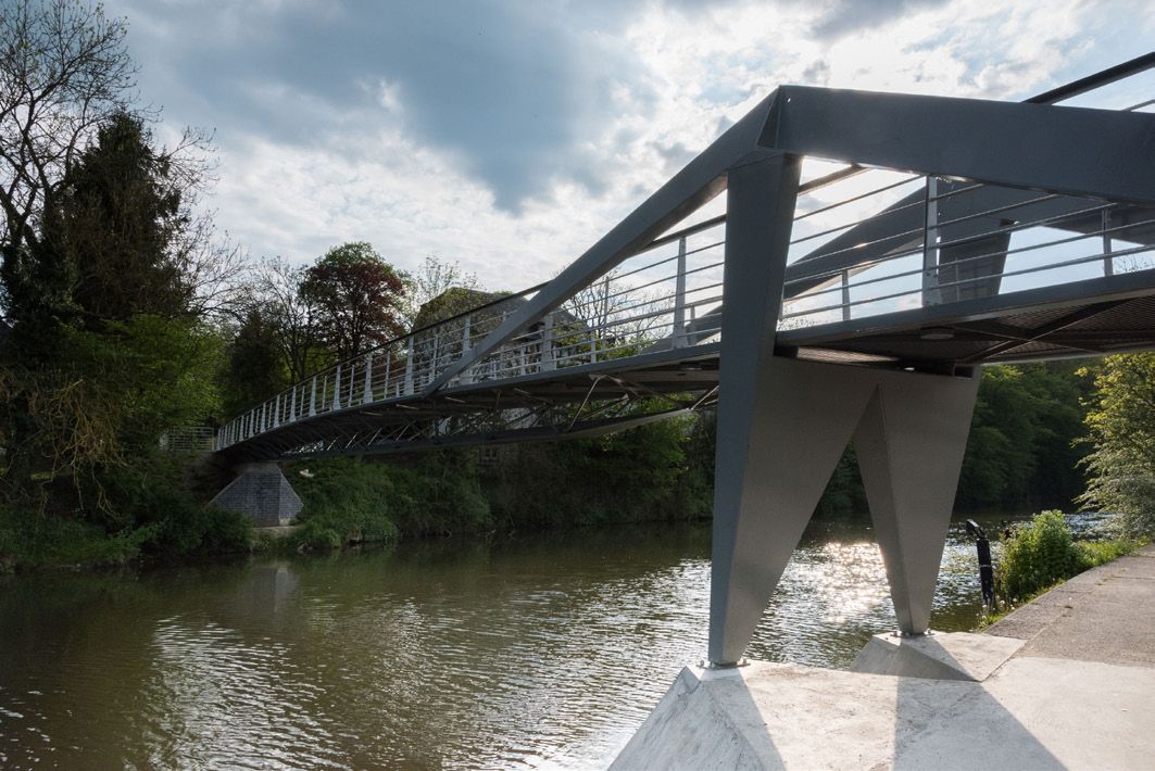 La passerelle rejoint en un biais discret deux quartiers à Barvaux qui s’étend en contrebas. La passerelle, d’une longueur de 48,50 m (portée maximale : 30 m), a été conçue suivant un principe d’économie qui lui donne toute sa légèreté. Ainsi, le poids total de l’acier (S235 et S355), garde-corps compris, n’excède pas 21,5 t et l’ouvrage complet a pu être déposé sur ses appuis en un seul mouvement de grue.