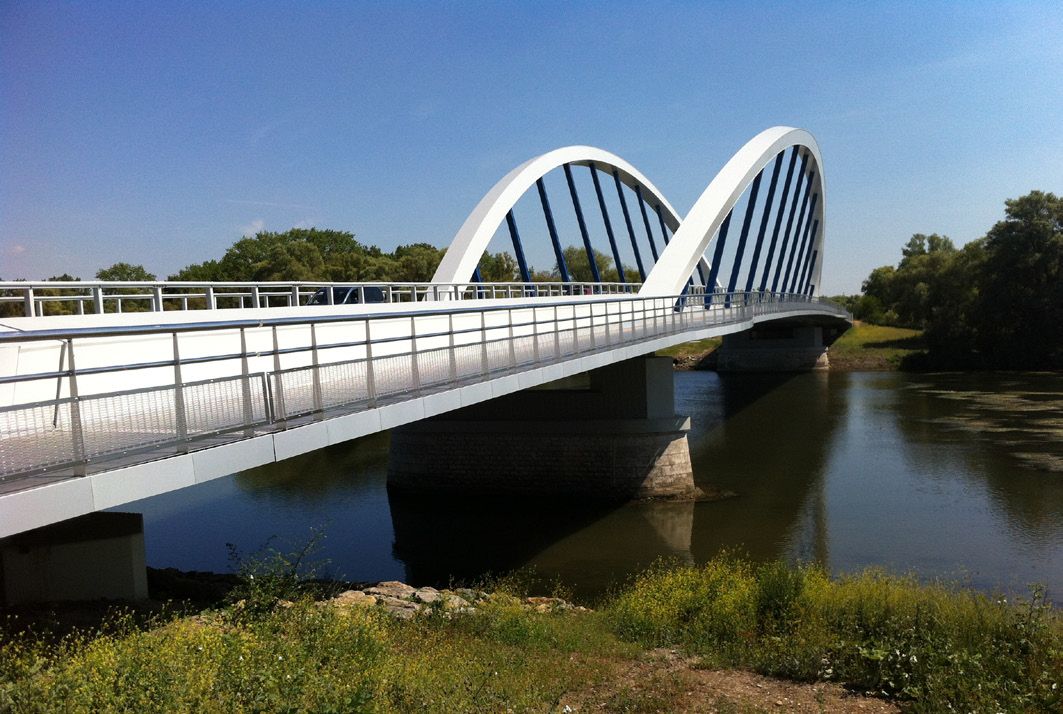 L’ancien pont sur la Moselle a été remplacé par un nouvel ouvrage de 180 m de longueur de type bow-string. Cette technique a permis d’élargir le pont et d’intégrer des voies sécurisées dédiées aux modes de déplacement doux (piétons, vélos, cavaliers...). Mais surtout sa solidité a permis de rétablir le trafic des poids lourds et de l’ouvrir aux convois exceptionnels.