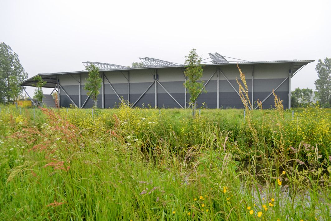 Bâtiment à la conception quelque peu originale, auquel ont présidé de nombreuses études et de nombreux plans. L’efficience et un concept élancé vont ici main dans la main. La portée libre de 30 m avec une structure sur la face extérieure et le nombre réduit de colonnes à l’intérieur garantissent une utilisation optimale du volume. Au lieu d’une fondation sur pieux coûteuse, les façades ont été exécutées sous la forme d’une charpente robuste. Les panneaux muraux isolés sont des Joris Ide (JI WALL 1000 VB 80 avec Colorcoat HPS200 Ultra®).