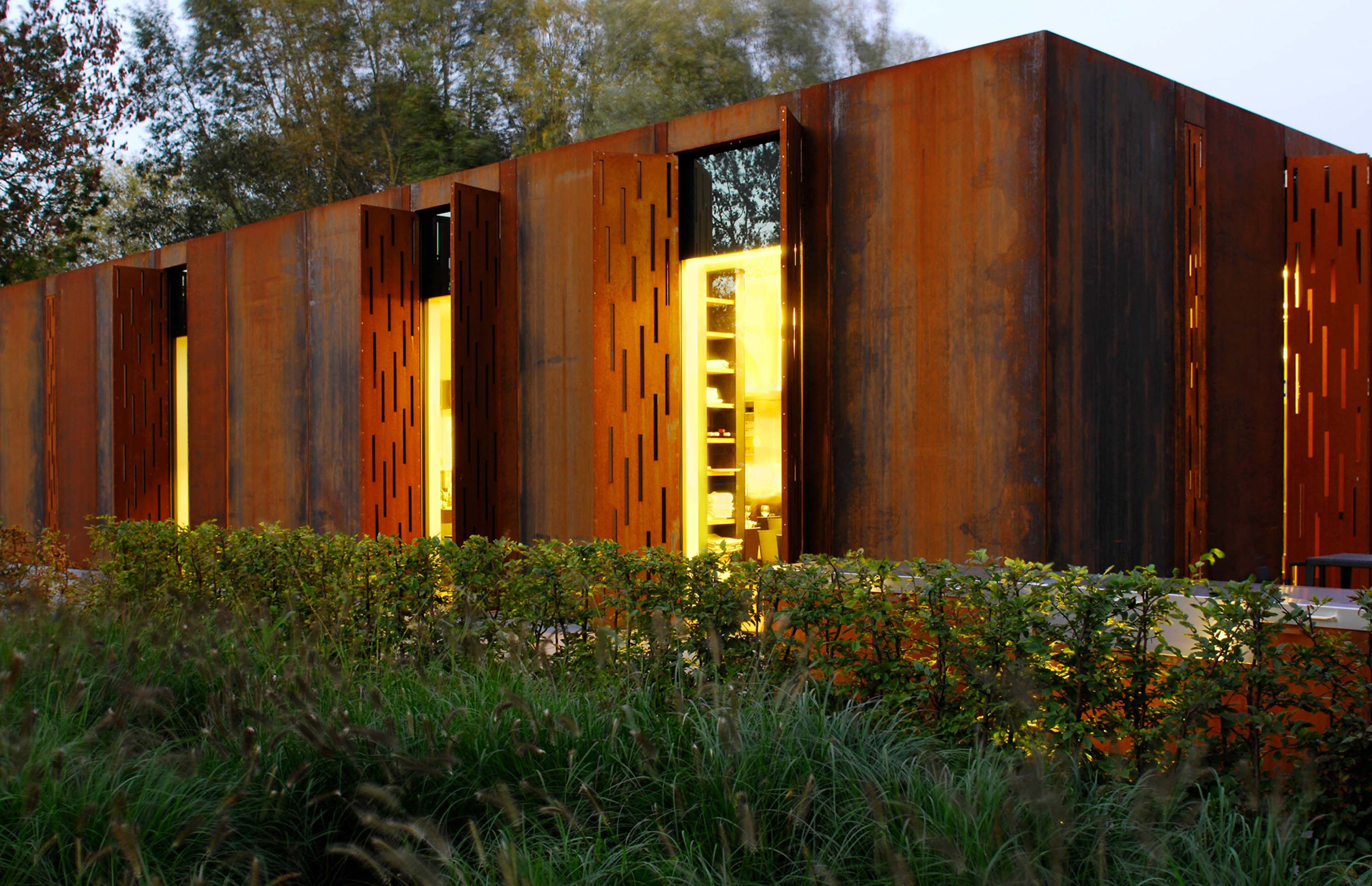 Les façades du bâtiment sont en acier auto-patinable. Les fenêtres sont protégées par des éléments pliables fendus, également en acier auto-patinable, qui permettent de magnifiques jeux de lumière. Une attention particulière a donc été apportée au revêtement extérieur, aussi bien pour les matériaux employés que pour la fonction de la façade.