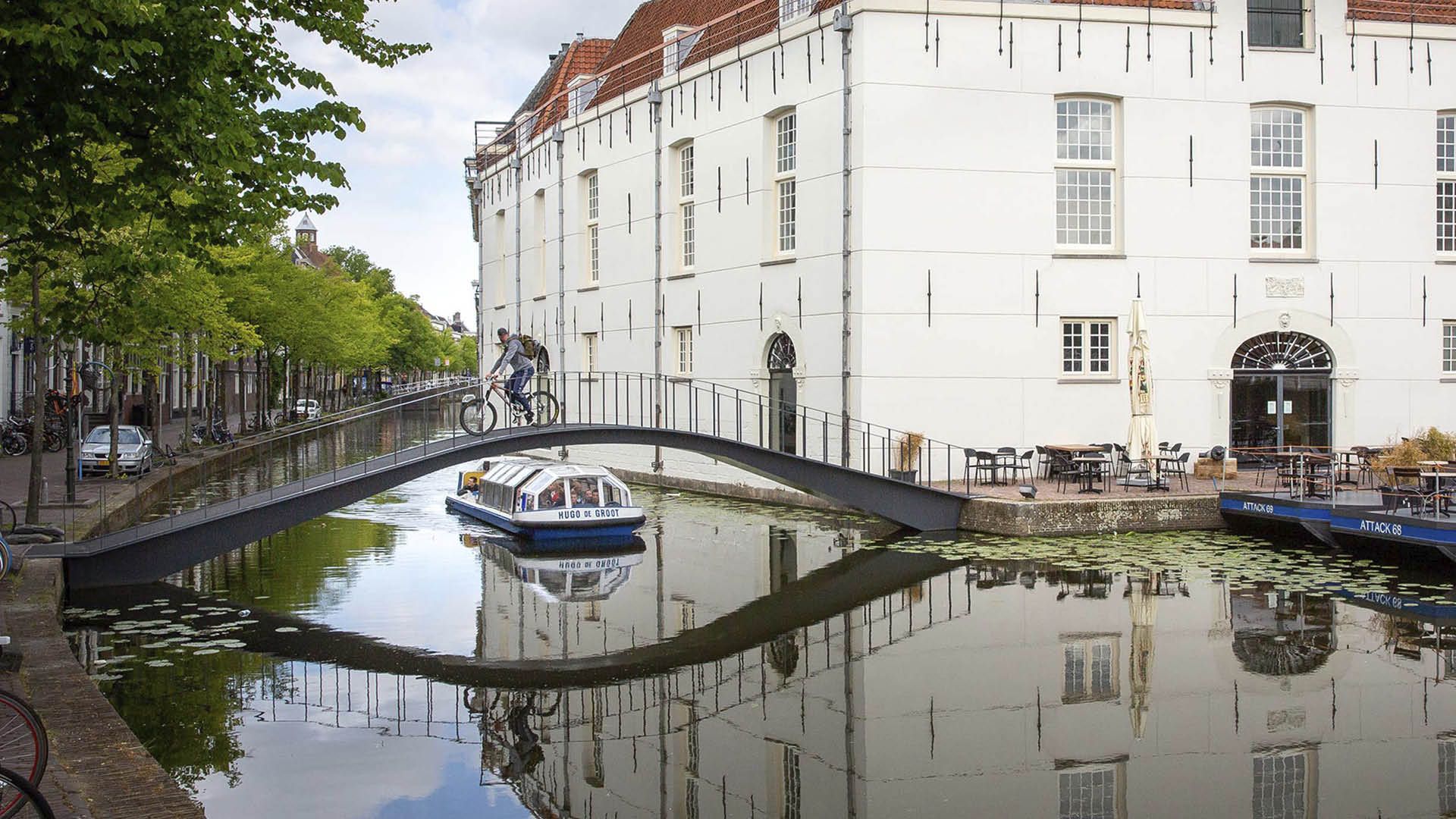 Pour désenclaver l'ancien musée de l'armée à Delft (NL), deux ponts en arc en acier pour les piétons ont été installés. Les ponts franchissent les canaux respectivement d’une distance de 13 et 16 m et mènent à l'hôtel, au restaurant et au centre de conférence dans l'ancien magasin d'artillerie.