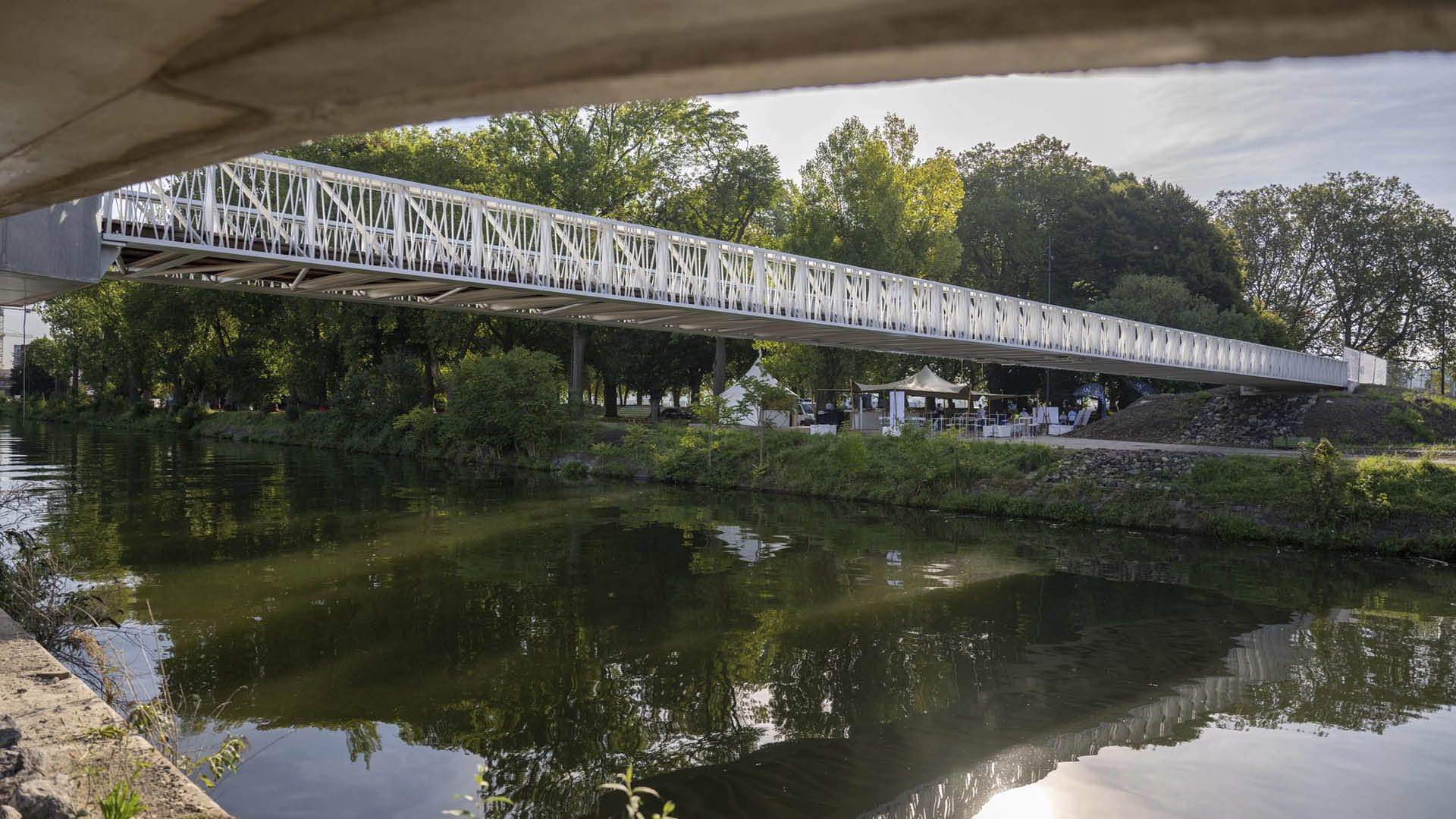 La passerelle a une contreflèche et est équipée de 4 amortisseurs à mi-portée assurant le confort d’utilisation.