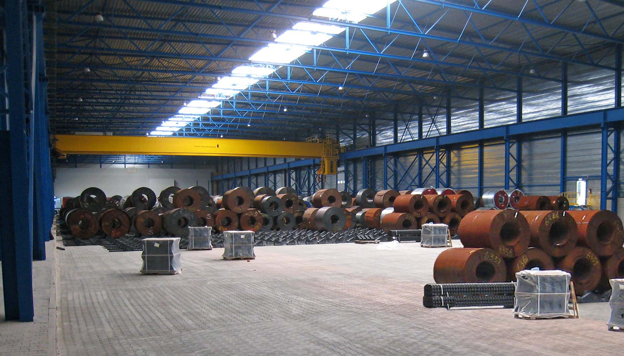 Le Limburgs Staalservice Center (LSC) est installé à Bree, le long du Zuid-Willemsvaart. Le bâtiment a été conçu pour produire annuellement 200.000 tonnes de tôles en acier custom-shaped et les livrer just in time. Ce n’est pas par hasard que LSC s’est installé à cet endroit : le transport par voie fluviale est en effet à la fois plus économique et respectueux de l’environnement. Les grandes portées et la rapidité de la construction ont conduit l’architecte et le maître d’ouvrage à opter pour une structure en acier. Le projet comprend sept hangars auxquels vient s’ajouter un auvent traversant le canal. La construction de l’ensemble a demandé 1.564 tonnes d’acier. Chaque hangar est doté de un à deux ponts roulants d’une capacité de levage de 40 tonnes et d’une portée de 28 ou 40 m. Les parois extérieures sont constituées de caissons et bardages métalliques tandis que la toiture est formée d’un support en steeldeck. L’ensemble est complété par un bâtiment de bureaux d’une surface d’environ 1.100 m² bâti avec une ossature acier.