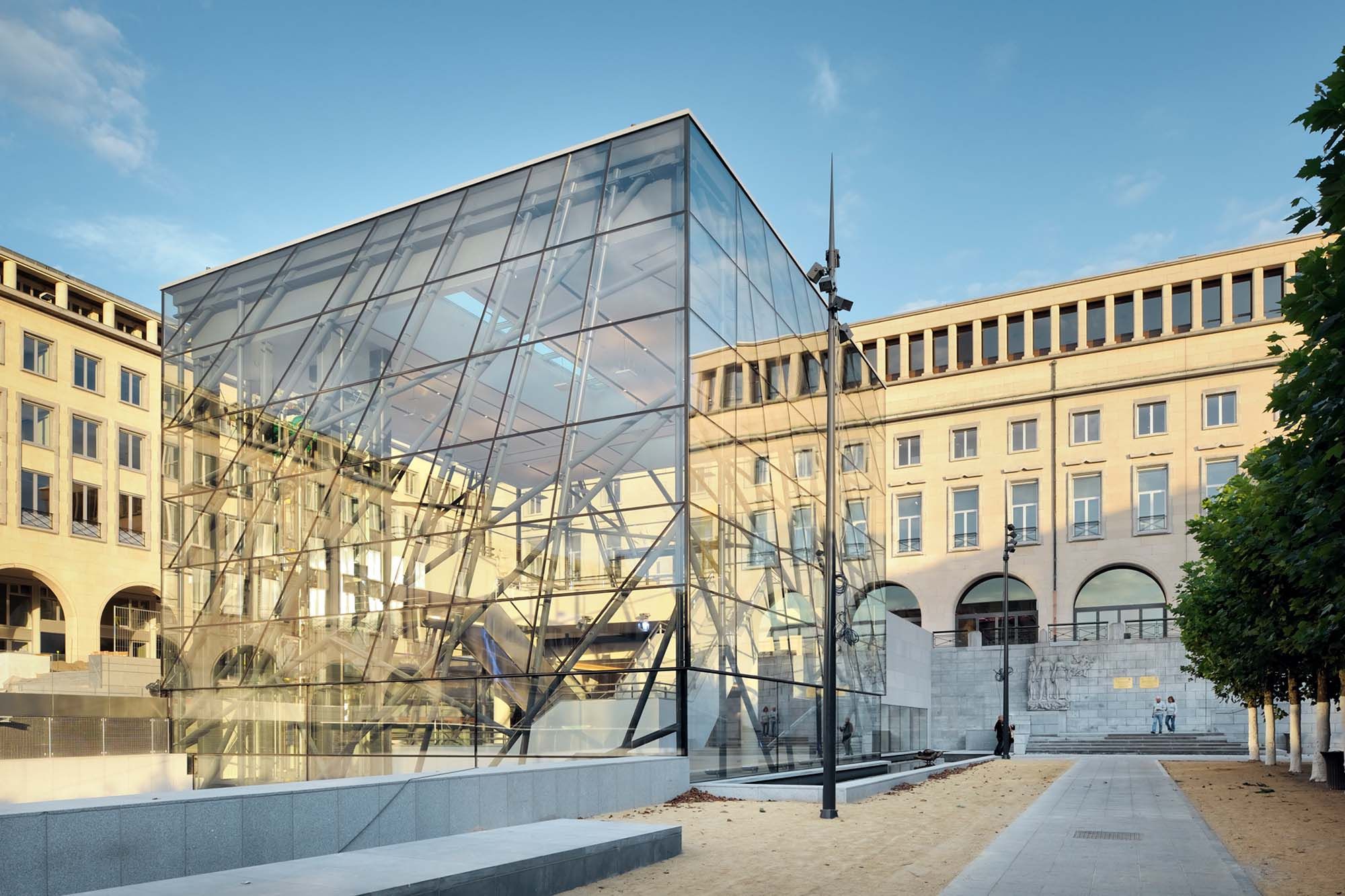 La structure arborescente du cube, traitée tout en transparence et en lumière, évoque l’architecture de jardin. Cette monumentalité douce et poétique dialogue avec le tracé des espaces publiques extérieurs. Le cube abrite un ruban d’escaliers suspendus et des passerelles reliant les différents niveaux d’accès du complexe. Le choix de profils en acier permet de réaliser une structure d’apparence aussi légère, transparente et aléatoire, qui souligne ainsi le caractère végétal du lieu.