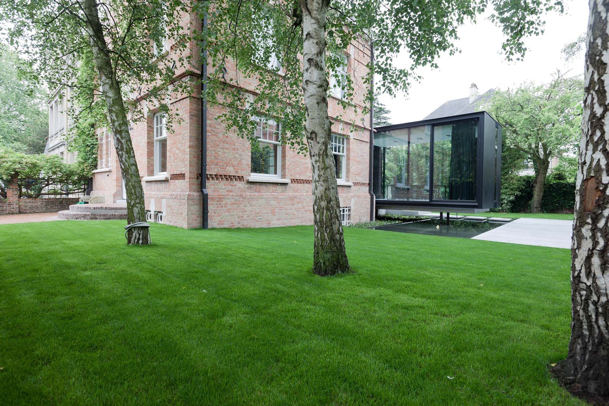En concertation avec les services du patrimoine (Monumentenzorg), une habitation datant du début du 19e siècle a été restaurée complètement dans son état originel et agrandie simultanément par l’adjonction d’une extension en acier à l’arrière et sur le côté. Dans ce projet, on a cherché à créer un volume complètement contrasté par rapport au caractère historique de l’habitation classée. L’acier s’est révélé être la solution adéquate pour la réalisation du projet dans son ensemble et pour y apporter un raffinement moderne, tant dans les rapports des volumes que dans la finition des détails ou l’utilisation des matériaux.