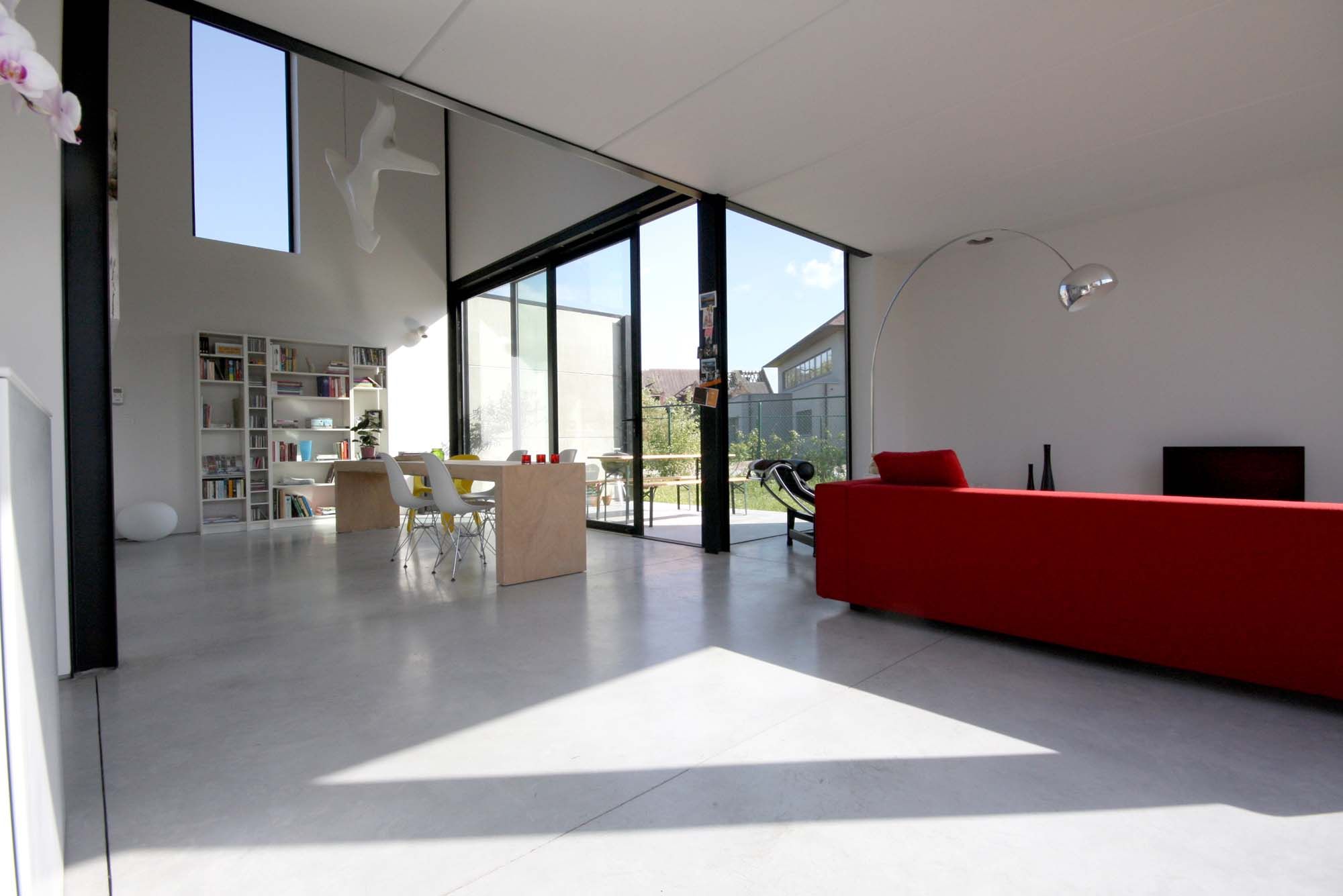 Cette habitation unifamiliale à Merelbeke a été réalisée avec une structure en acier invisible de l’extérieur. Des panneaux lisses blancs en béton et des panneaux sandwich métalliques sombres ont été montés sur cette structure. Les panneaux métalliques préfabriqués Kingspan ont une isolation de 10 cm PUR et sont revêtus tant à l’intérieur qu’à l’extérieur d’un platelage métallique plat. Leurs côtés extérieurs ont été alignés avec les panneaux de façade préfabriqués et isolés en béton. Une structure en acier secondaire a été réalisée à cette fin avec des profilés en L. Les poutres primaires de la structure en acier sont également en forme de L de manière à ce que le plafond se prolonge autant que possible de manière continue. Elles sont dissimulées dans l’épaisseur du plancher. Les murs intérieurs sont tous non porteurs et ont été répartis selon le rythme des poutres et colonnes de la structure en acier.