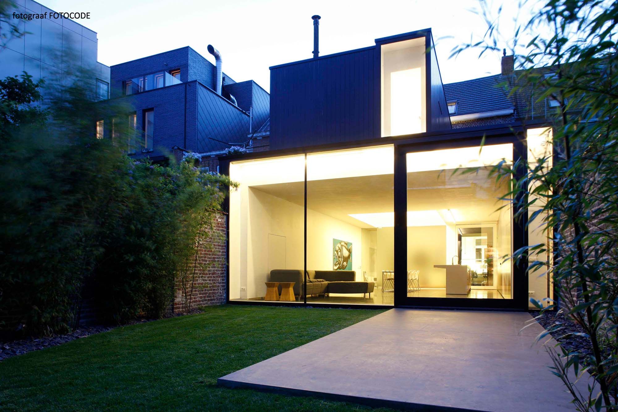 Le projet concerne la transformation profonde d’une maison de maître du 19e siècle. Alors que la façade imposante de la maison garde son cachet authentique plutôt secret, la partie arrière contraste par ses espaces d’habitation particulièrement aérés et clairs. Le grand espace libre, le patio, les larges verrières, la lumière zénithale et les perspectives variées créent un espace à l’ambiance captivante. La fenêtre sur la largeur totale de la pièce, projette véritablement le jardin à l’intérieur de la maison. Le choix s’est porté sur une structure principale en acier dans le but de disposer d’un plan ouvert. Des colonnes, cachées dans une contre-cloison et dans une armoire multifonctionnelle, ont ainsi été érigées le long des deux murs communs. Les poutres en acier ont été intégrées dans l’épaisseur des hourdis afin d’éviter leur affaissement. Comme pour l’essentiel l’acier a été rendu invisible, il ne constitue pas un élément visuel frappant ; seul le puzzle raffiné d’éléments en acier pimente cette sobre architecture. Rien de spectaculaire donc, mais de l’efficacité.