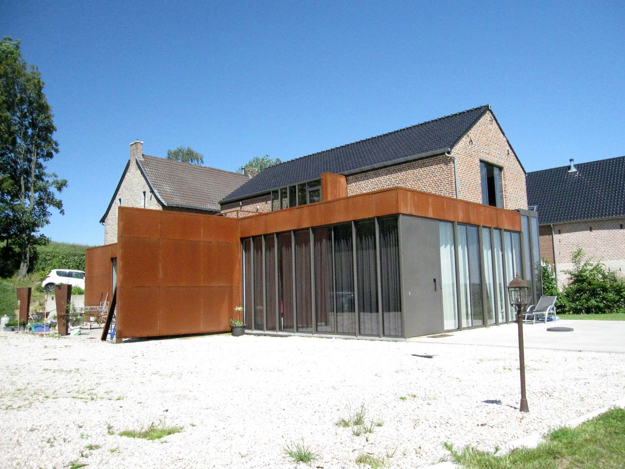 Une ancienne ferme située au cœur du Pays de Herve a été entièrement rénovée. Elle accueille, trois appartements et une piscine couverte. Une nouvelle construction se greffe au bâtiment principal existant. Elle est revêtue d’acier autopatinable. Le bardage est en parfaite harmonie avec le cadre dans lequel il s’insère, la teinte rouille s’affichant largement à travers nos paysages tout au long des saisons. L’ensemble est homogène, mais chaque élément porte bien la marque de son époque. L’acier autopatinable a été mis en œuvre aussi simplement que possible : il n’y a pas de débordements, l’ensemble est monolithique, les tôles d’acier sont de grandes dimensions. Le bardage accentue les lignes contemporaines de l’annexe. Il crée un dynamisme géométrique, anguleux et précis.