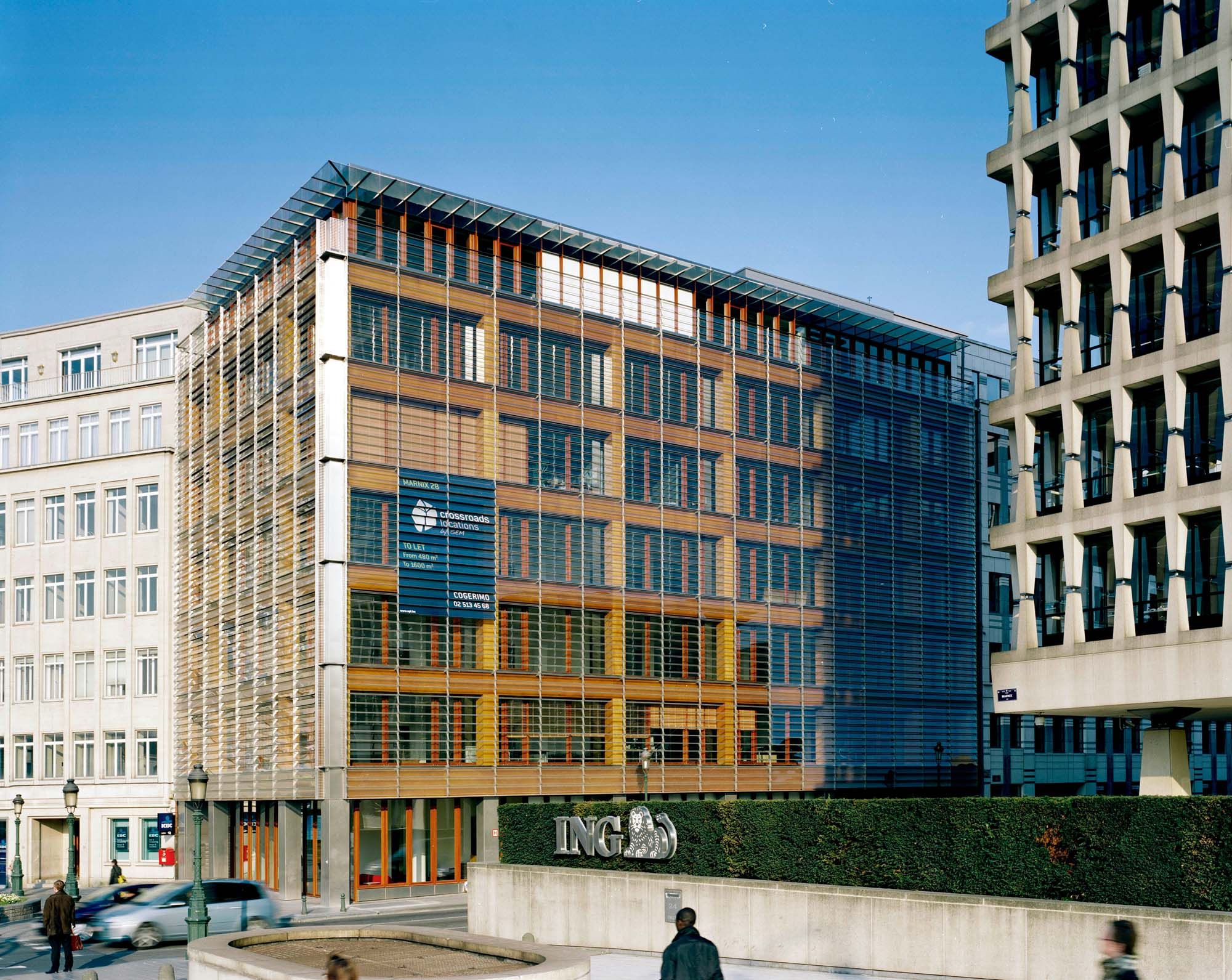 L’immeuble d’origine, une construction traditionnelle des années 1960, était devenu obsolète et demandait une rénovation profonde pour répondre aux nouvelles demandes des utilisateurs. La structure de l’immeuble est mise à nu. Les trumeaux décoratifs de façade sont tous supprimés pour offrir une vue panoramique sur le parc royal et tout le sud de Bruxelles. L’ancienne façade en pierres agrafées et en châssis d’aluminium, non isolée, fait place à une nouvelle façade en bois largement vitrée et équipée de stores pare-soleil orientables à lamelles de bambou. Un rideau de ventelles de verre encadrées d’acier inoxydable protège de la pluie le bois des étages +1 à +5 et se complète par un auvent vitré continu à l’étage +6. Au rez-de-chaussée, ainsi que sur l’angle des deux façades à rue et au droit des murs mitoyens, la protection du rideau de ventelles s’interrompt et la façade s’habille d’acier inoxydable.