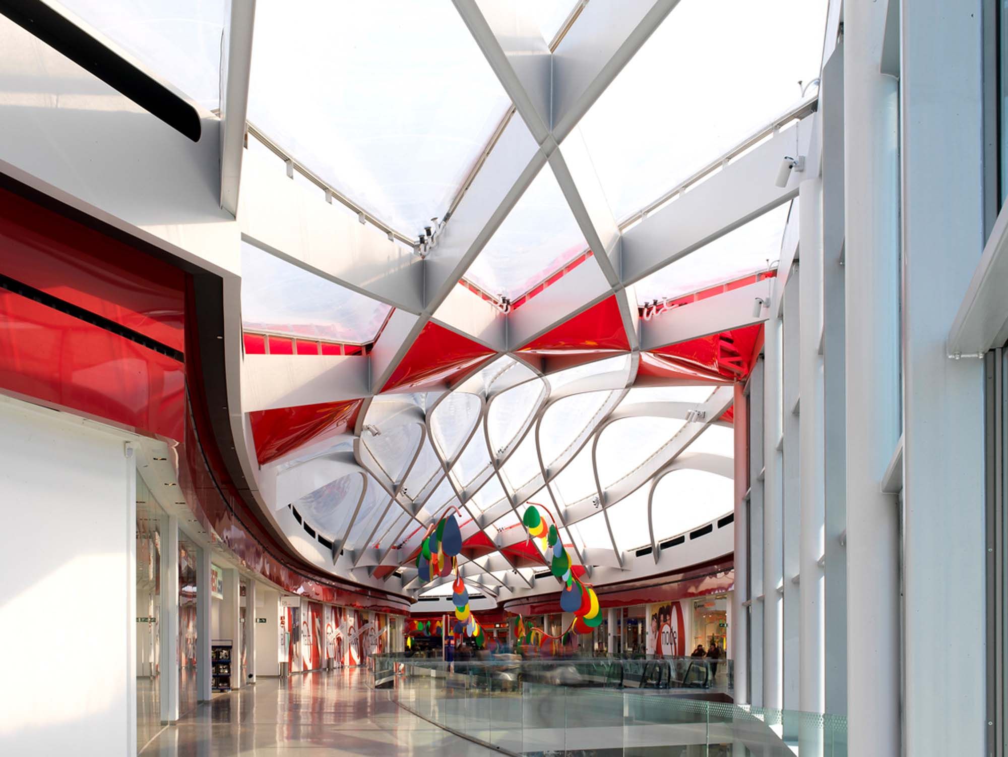 Le complexe Médiacité à Liège, un des plus grands centres commerciaux du pays avec ses 450 m de longueur et sa surface de 160.000 m², se caractérise par une impressionnante toiture ondulée. La couverture est constituée d’un coussin transparent gonflable en plastique EFTE. Le toit en acier proprement dit est divisé en huit parties, d’une longueur variant entre 30 et 75 m, séparées par des joints de dilatation. Ces pans de toiture enjambent la galerie commerciale, une portée de 10 à 21 m. La structure complexe en acier est constituée de poutres caissons soudées, d’une longueur et d’une courbure uniques. L’épaisseur des profilés varie de 8 à 40 mm. Ceux-ci ont été soudés aux éléments de toiture lors d’un pré-montage ; les éléments ainsi obtenus étaient encore tout juste transportables par la route. Les poutres caissons contribuent à la stabilité globale du toit.