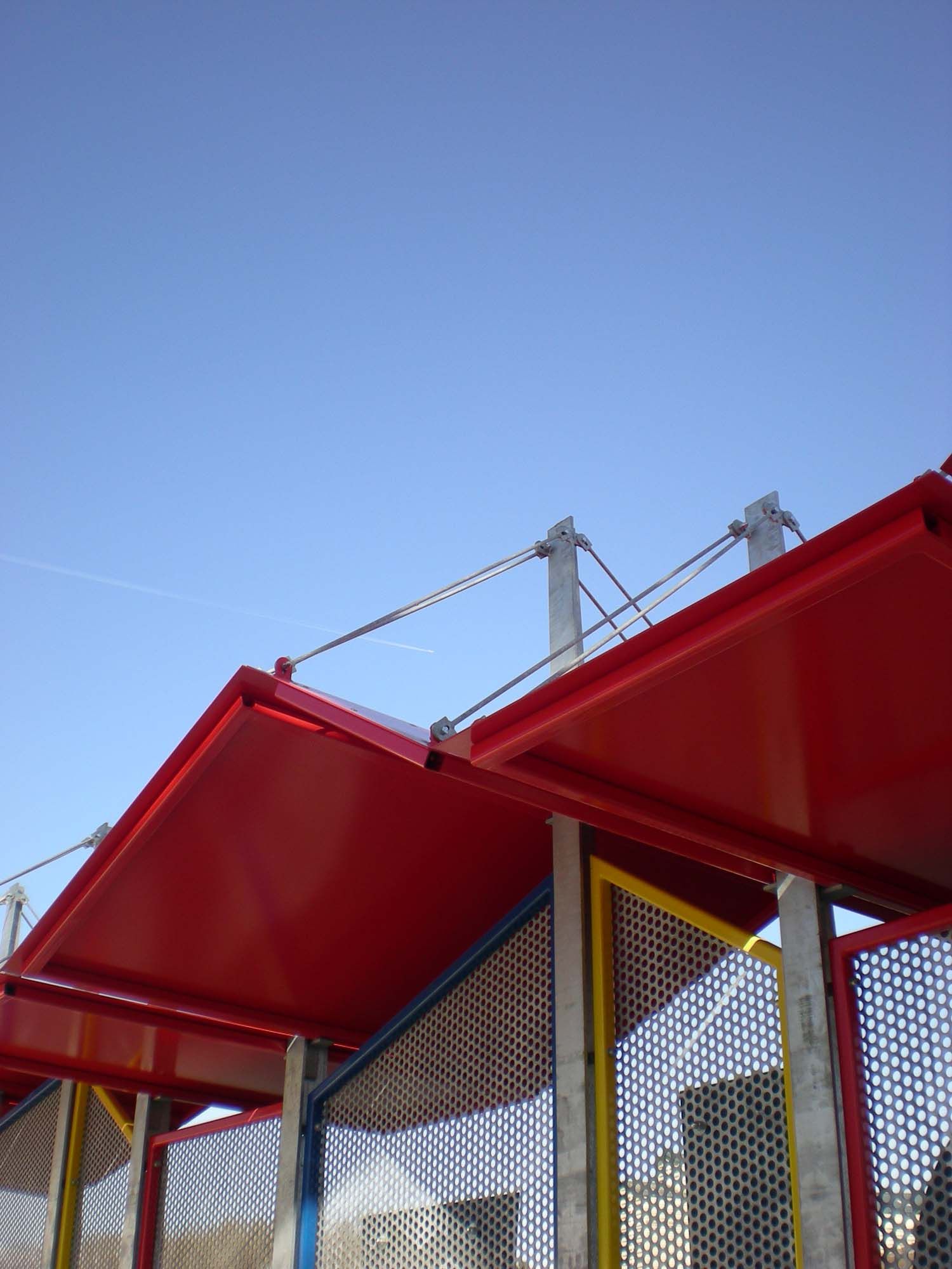 Le projet s’inscrit dans la requalification du centre de Guignies. Dans cette requalification, la cour de l’école maternelle était à repenser. Le parti architectural est de mettre en valeur un arbre de plus de 100 ans, planté dans la cour de l’école. Toutes les lignes directrices se concentrent vers cet arbre. Pour garantir la vue depuis l’espace public, le choix de panneaux galvanisés perforés a été retenu. Toute la structure de cette enceinte a été déterminée en acier, depuis les poteaux jusqu’à l’auvent. Les cadres des panneaux sont réalisés en acier laqué dans les trois couleurs primaires pour le petit clin d’œil par rapport à l’apprentissage scolaire. Ces couleurs se retrouvent d’ailleurs sur le côté cour de l’école. Des panneaux pleins ont été intégrés dans la structure pour y mettre des informations. L’auvent, en acier laqué rouge, symbolise le toit de la ‘maison pour les enfants’.
