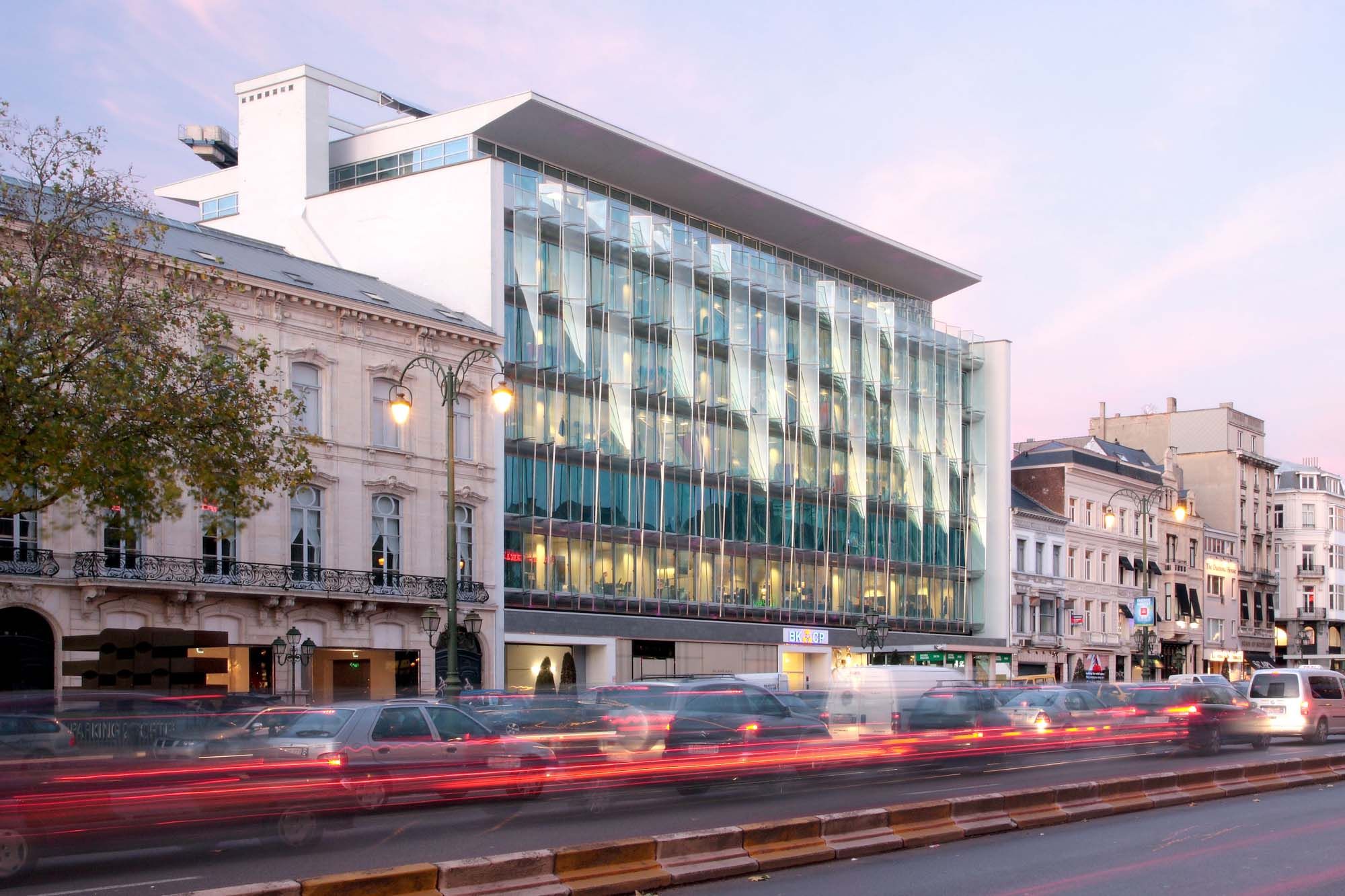 Pour le projet W16 constitué de trois parties bâties, la qualité d’une série d’espaces différents s’imbriquant les uns aux autres a été revalorisée de manière contemporaine. Un nouveau volume a ainsi été créé pour relier les bâtiments existants. Une seconde couche a été ajoutée à la composition sobre de la façade du bâtiment Van Kuyck. L’écran de passerelles horizontales en inox et de lamelles de verre verticales torsadées ramène la façade du bâtiment dans le plan du bâti du boulevard. En termes conceptuels, il était important que les cadres des lamelles de verre soient réalisés de la manière la plus fine possible, mais il fallait aussi tenir compte de la force du vent, de l’épaisseur du verre, des tensions dans le verre ainsi que de la dilatation du verre et du cadre sous l’effet de la chaleur. L’inox était à cet égard le meilleur choix de matériau. Il satisfait en effet aussi bien aux exigences techniques qu’esthétiques.